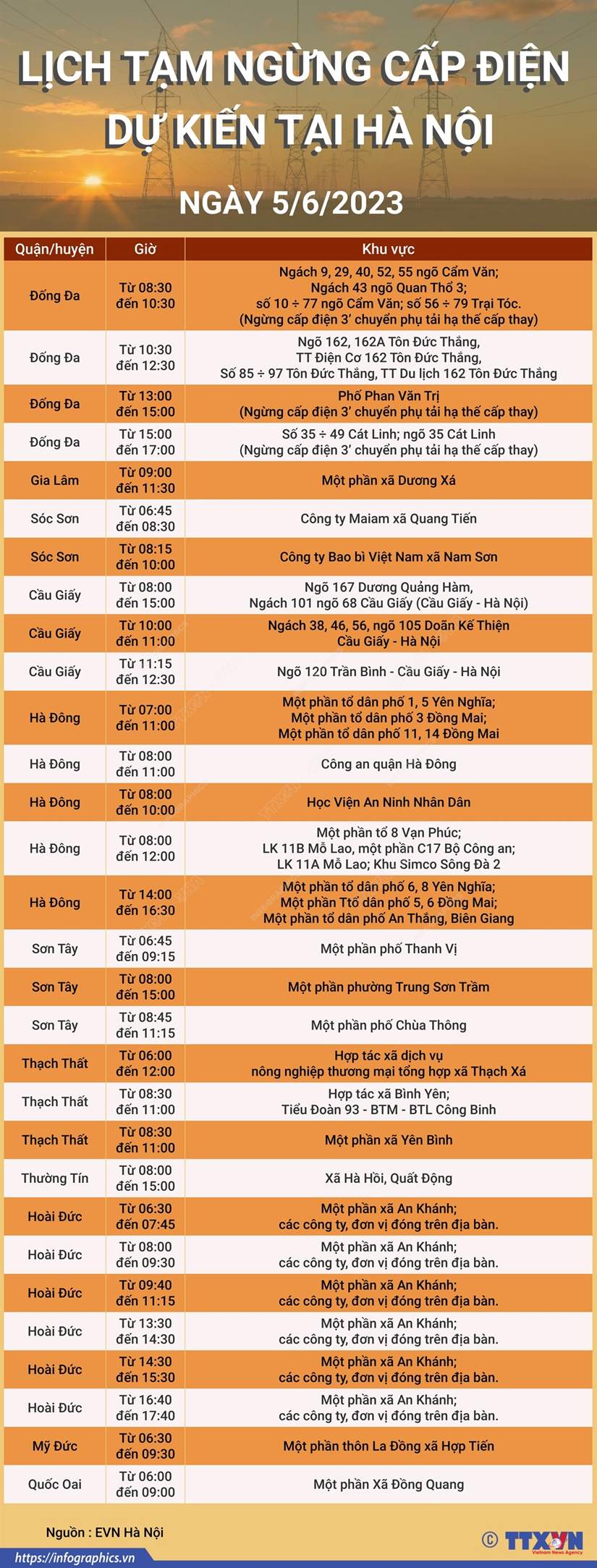 Trên đây là lịch cắt điện dự kiến ngày 5/6 tại các quận, huyện, thị xã ở Hà Nội.