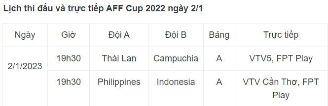 Lịch thi đấu AFF Cup 2022 ngày 2/1: Thái Lan chắc suất đi tiếp?