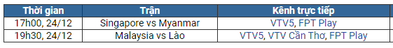 Trận đấu giữa Singapore và Myanmar sẽ diễn ra vào lúc 17h ngày 24/12; Vào lúc 19h30 cùng ngày sẽ là màn đọ sức giữa Malaysia và Lào.