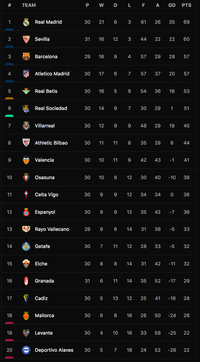 Bảng xếp hạng La Liga 2021-22.