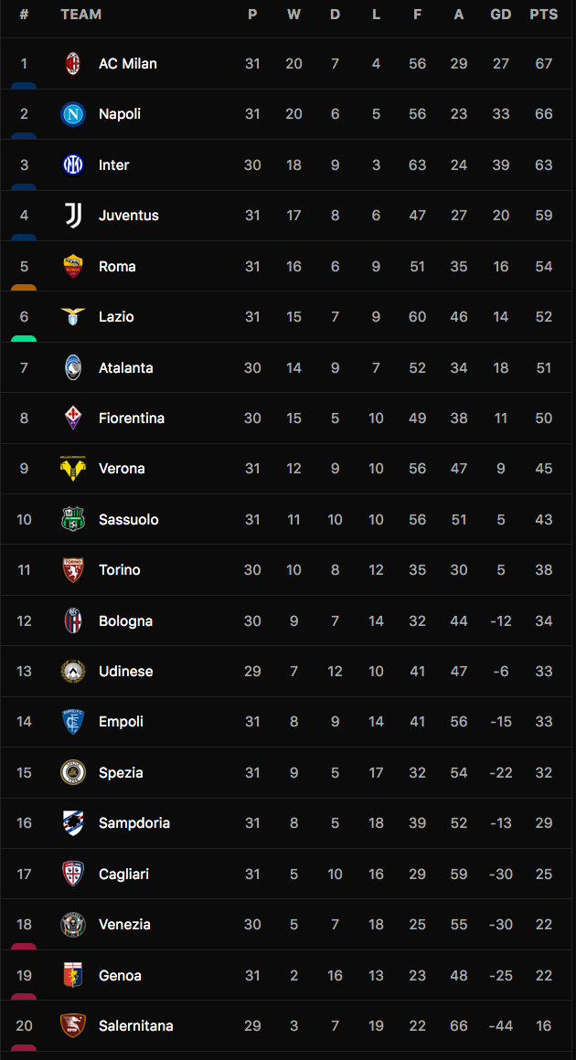 Bảng xếp hạng Serie A 2021-22.