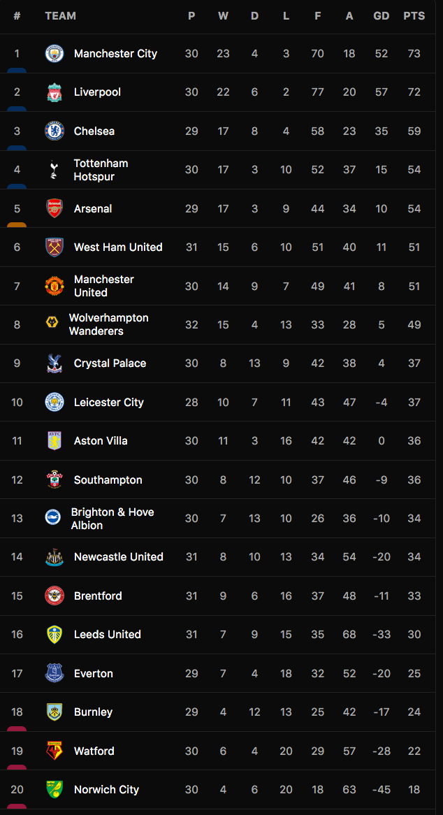 Bảng xếp hạng Premier League 2021-22.