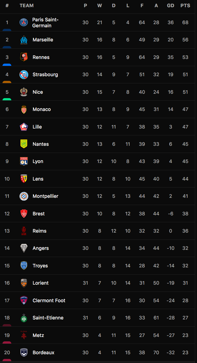 Bảng xếp hạng Ligue 1 2021-22.