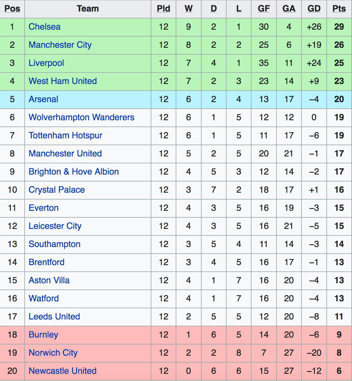 Premier League sau 12 vòng đấu đang chia nhóm rõ rệt. Chelsea đứng đầu bảng với 29 điểm, Man City (26 điểm) và Liverpool (25 điểm) đang bám đuổi quyết liệt ở phía sau, còn West Ham sắm vai "ngựa ô" khi xếp thứ 4 với 23 điểm.