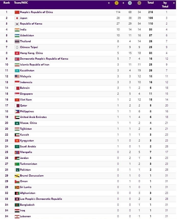 Bảng tổng sắp huy chương ASIAD 19 ngày 1/10