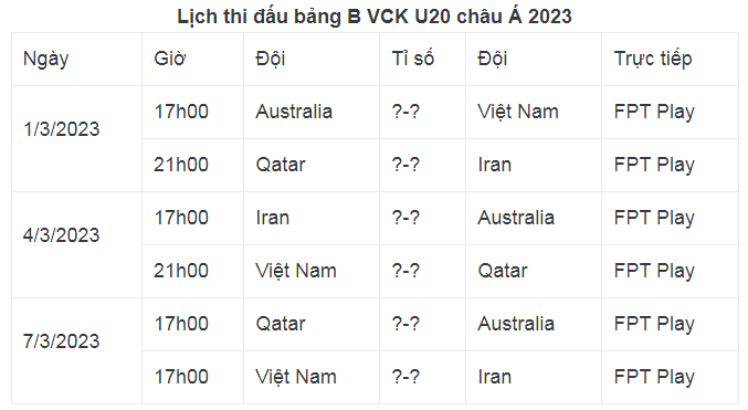 Trận đấu mở màn của U20 Việt Nam gặp U20 Australia trong khuôn khổ bảng B VCK U20 châu Á 2023 sẽ diễn ra vào 17h giờ Việt Nam ngày 1/3 trên SVĐ Istiqlol (thành phố Fergana, Uzbekistan). ĐT U20 Việt Nam do HLV Hoàng Anh Tuấn dẫn dắt sẽ ra sân trong trang phục màu đỏ.