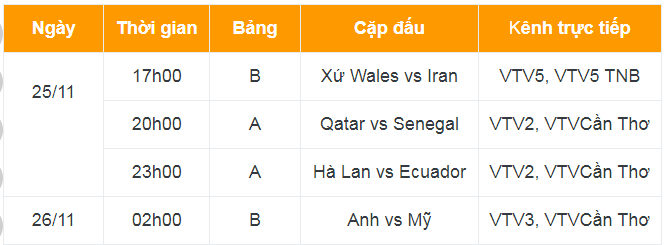 Lịch thi đấu World Cup 2022 ngày 25/11/2022