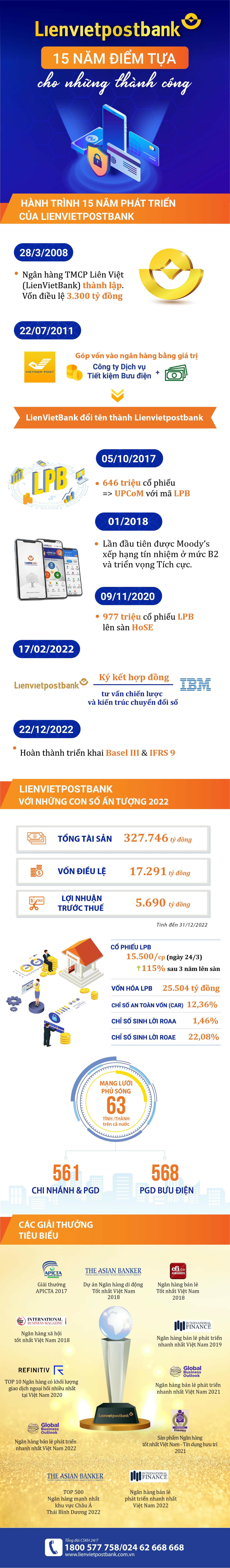 Sau 15 năm thành lập và phát triển, tổng tài sản của Lienvietpostbank đã vượt 327 nghìn tỷ đồng, lợi nhuận trước thuế tăng gấp 10 lần và đạt 5.690 tỷ đồng trong năm 2022. Với mạng lưới điểm giao dịch lớn bậc nhất hệ thống, Lienvietpostbank đang sở hữu lợi thế khác biệt để trở thành ngân hàng bán lẻ hàng đầu thị trường.