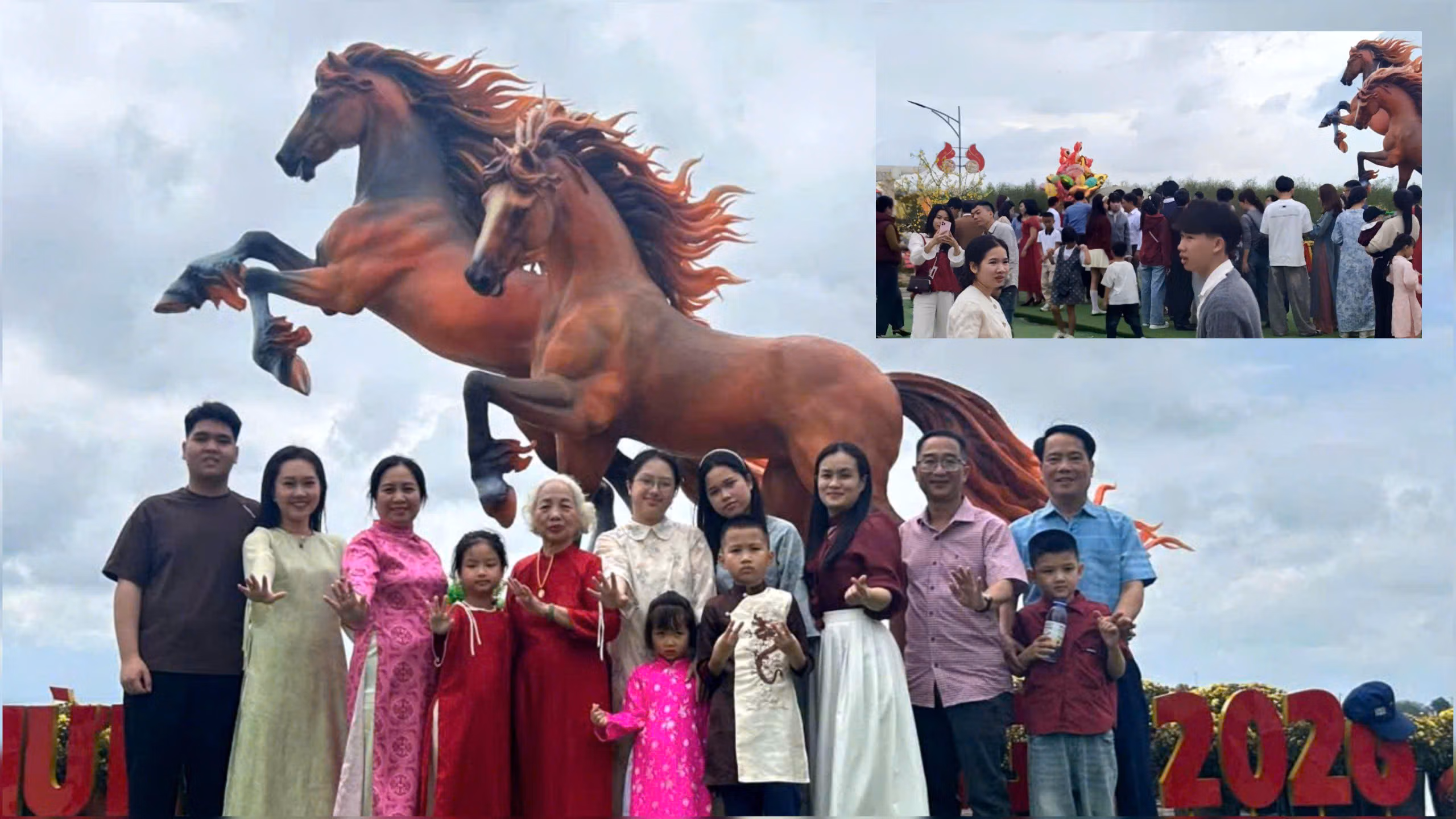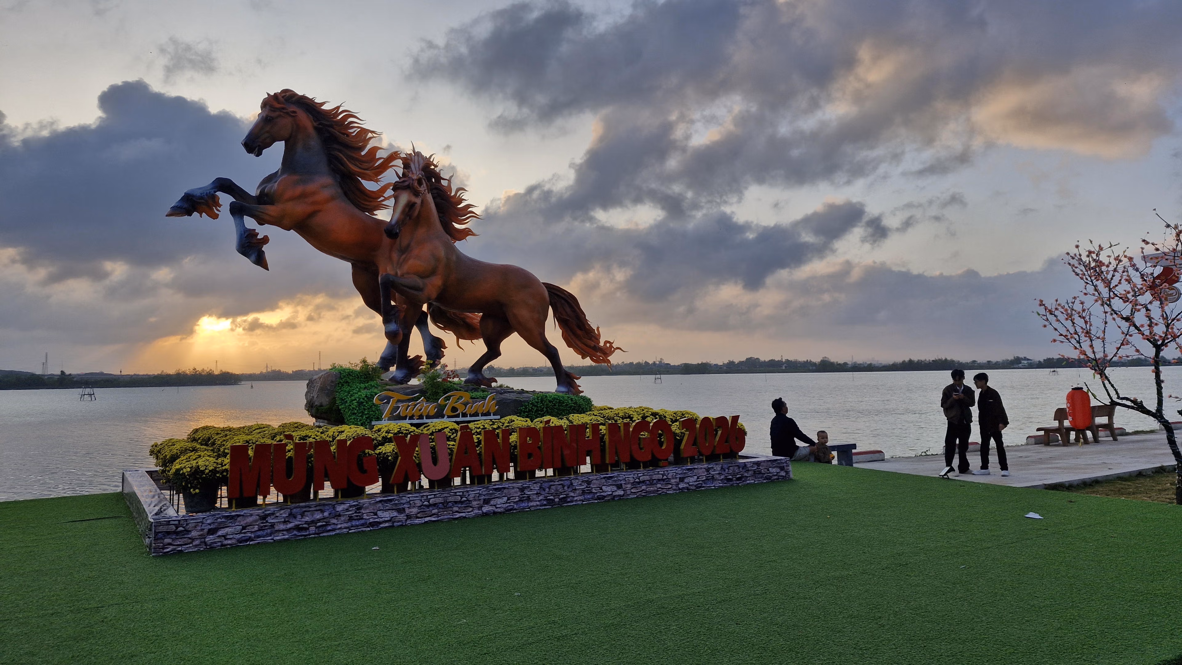 Linh vật Song Mã được trưng bày bên cạnh sông Thạch Hãn (xã Triệu Bình, tỉnh Quảng Trị) trở thành điểm nhấn, thu hút người dân đến tham quan, chụp ảnh lưu niệm trong dịp Tết Nguyên đán Bính Ngọ 2026.