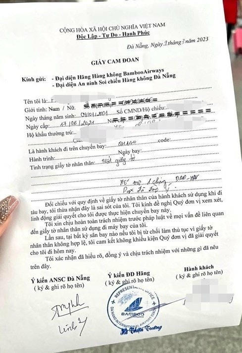 Hay cùng chuyến bay QH0144 của hãng Bamboo Airways, hành khách N.(tên viết tắt HHN) không có giấy tờ tùy thân sau khi chuyển tiền triệu cho đầu mối môi giới thì được cấp ngay một tờ giấy có con dấu Bamboo Airways để lên máy bay.
