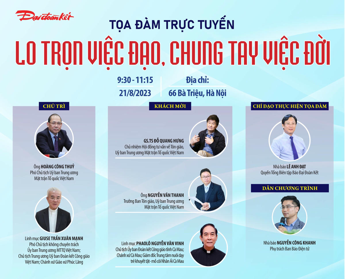 Với mong muốn lan tỏa những tấm gương đồng bào Công giáo yêu nước, tấm gương các chức sắc, chức việc, tu sĩ có nhiều đóng góp trong nỗ lực phát triển xã hội, Báo Đại Đoàn Kết tổ chức Tọa đàm trực tuyến: “Lo trọn việc đạo, chung tay việc đời” được tổ chức vào 9h30 ngày 21/8/2023.
