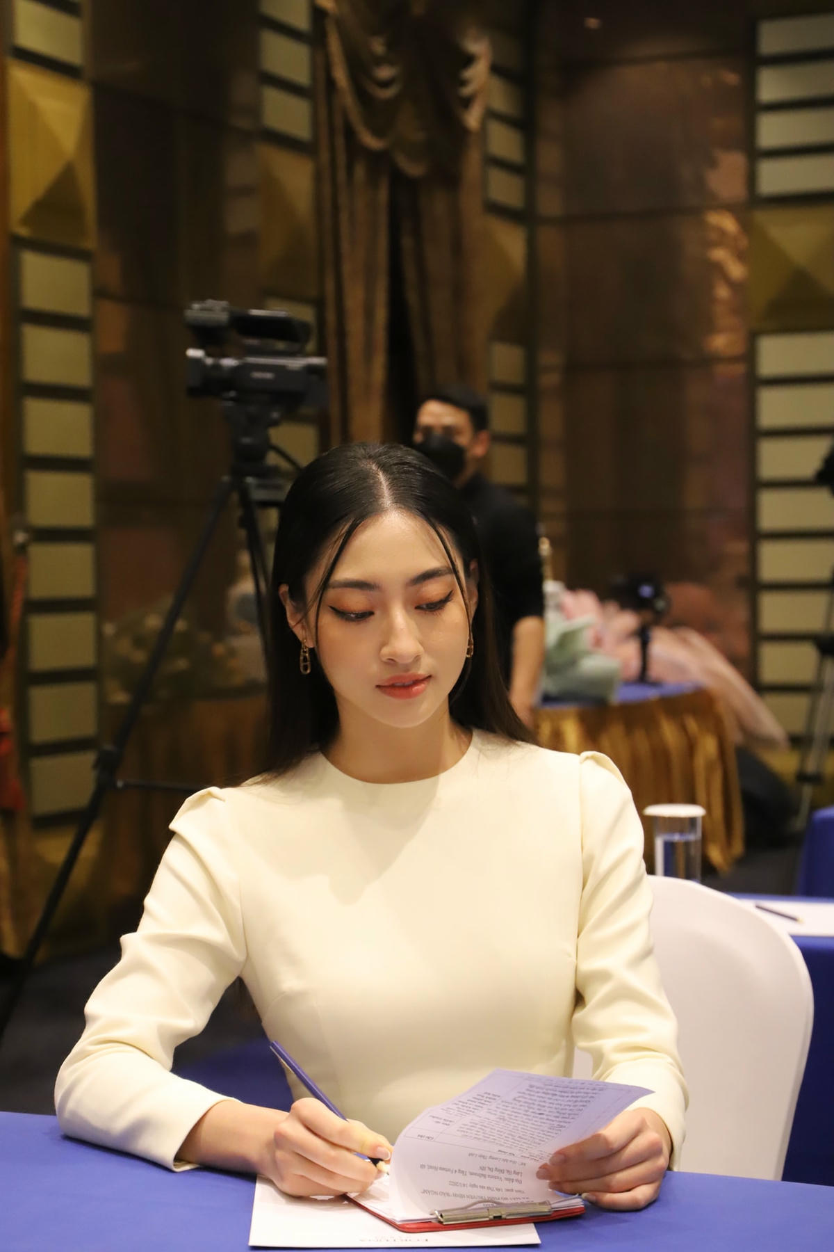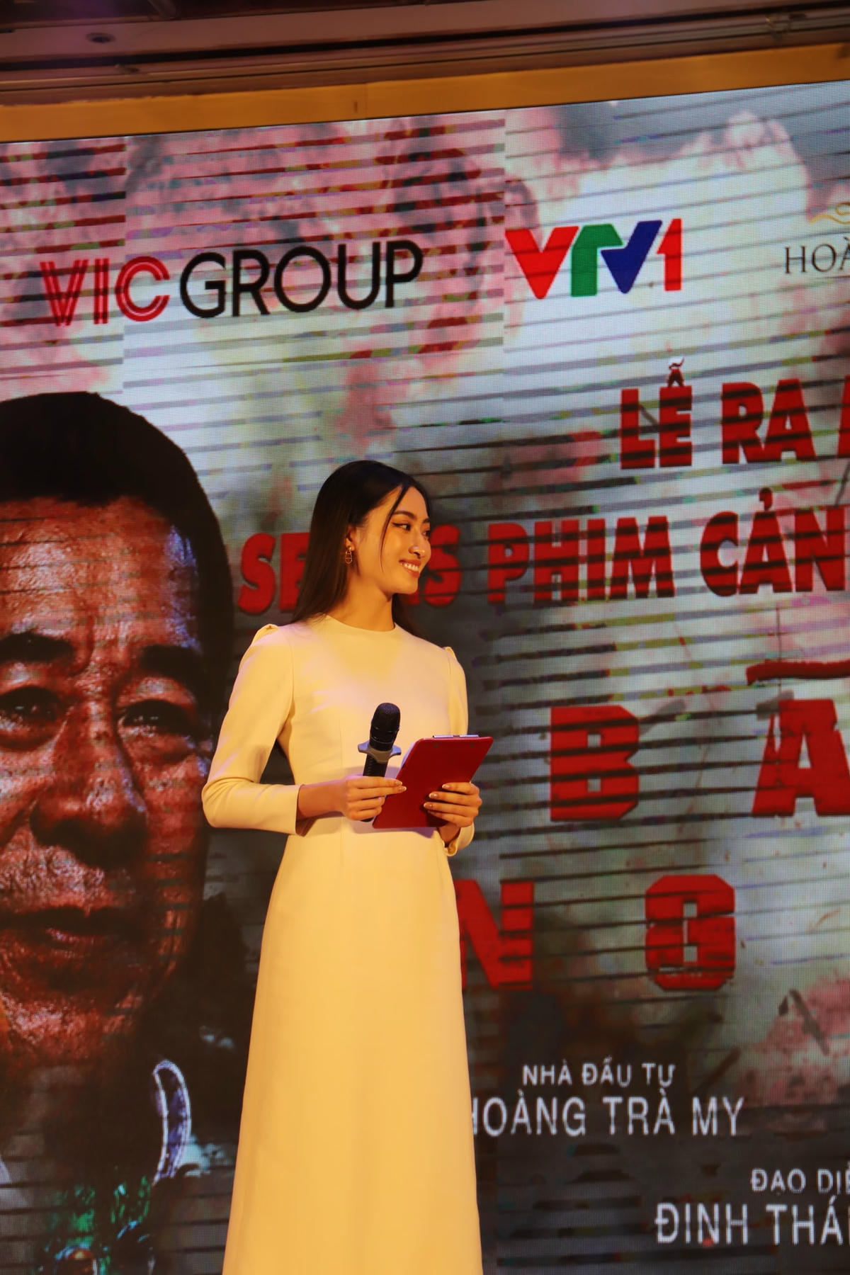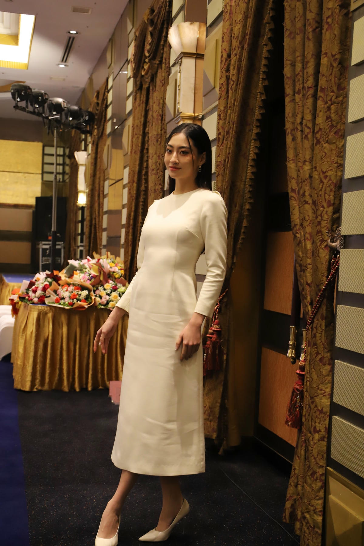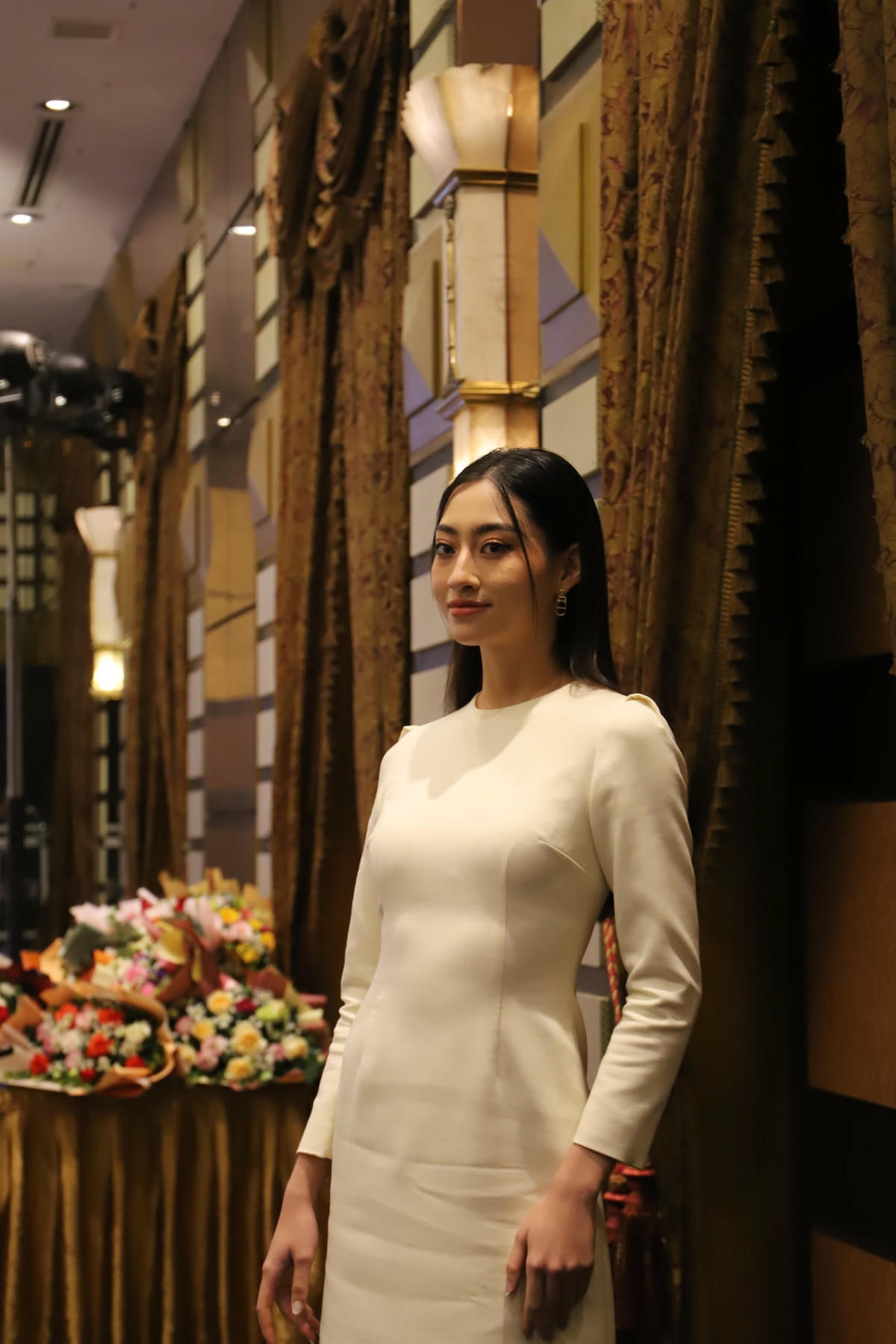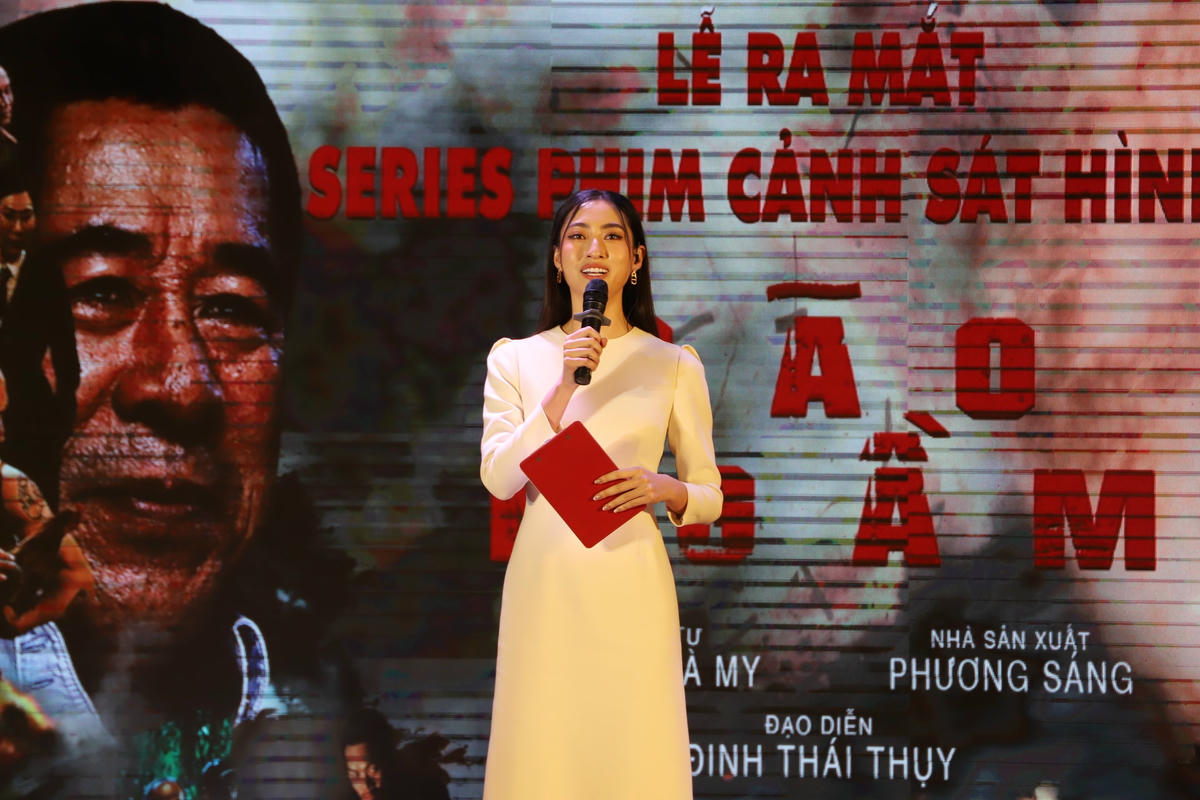 Xuất hiện với vai trò MC họp báo ra mắt phim "Bão Ngầm", Hoa hậu Thế giới Việt Nam 2019 Lương Thuỳ Linh rạng rỡ trong bộ đầm trắng cực "hút mắt".