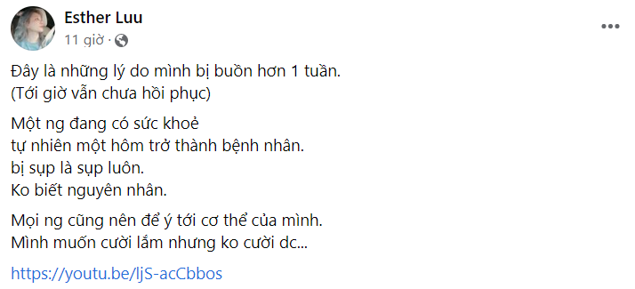 Hari Won viết: “Đây là lý do tôi buồn hơn 1 tuần (tới giờ vẫn chưa hồi phục). Từ một người đang khỏe tự nhiên một hôm trở thành bệnh nhân, không biết nguyên nhân. Mọi người nên để ý tới cơ thể của mình. Tôi muốn cười lắm nhưng không cười được”.