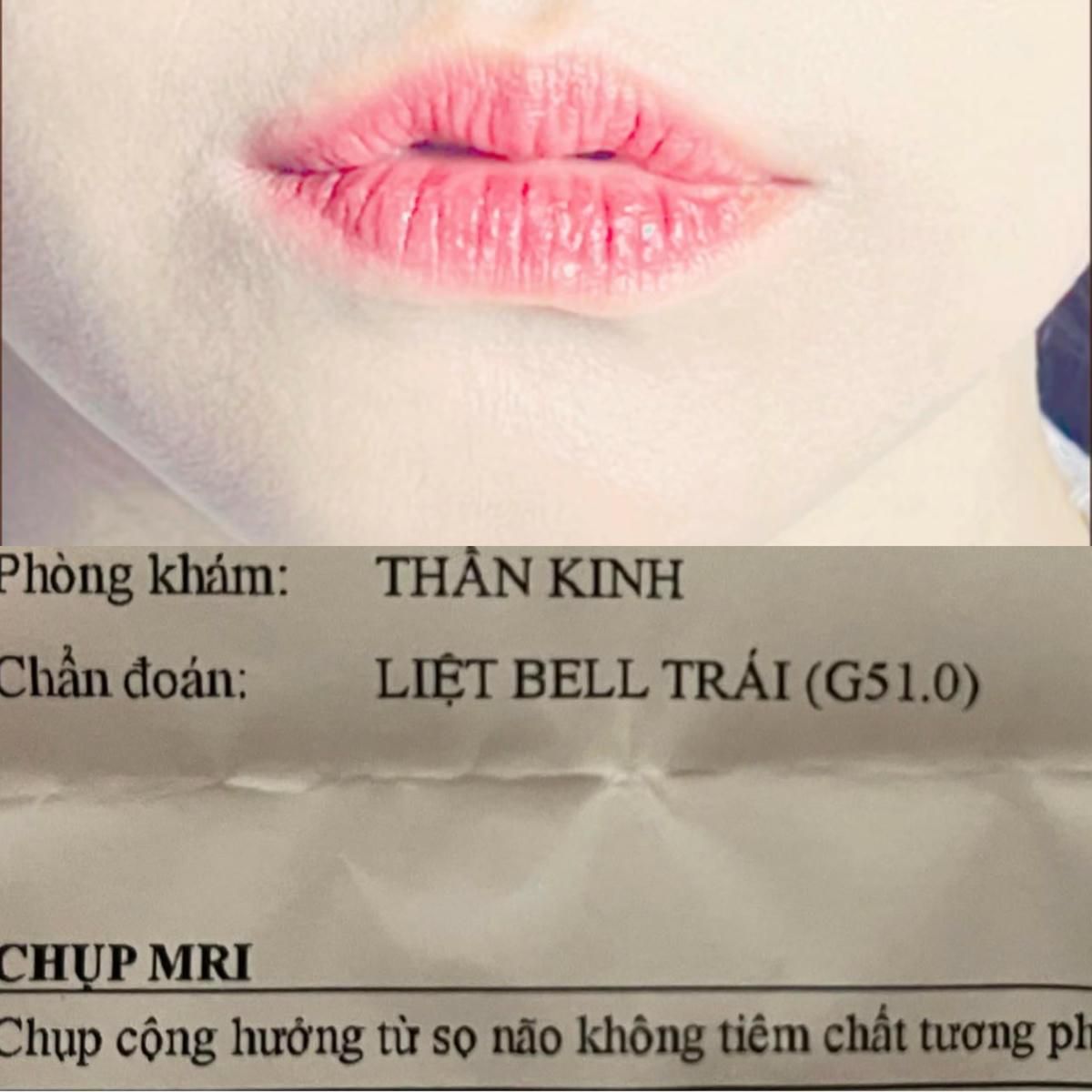 Mới đây trên trang cá nhân, ca sĩ Hari Won đã đăng tải bài viết kèm ảnh giấy khám bệnh và ảnh nửa miệng trái bị lệch của mình. Theo thông tin từ tờ giấy khám, Hari Won được chuẩn đoán liệt cơ mặt trái.