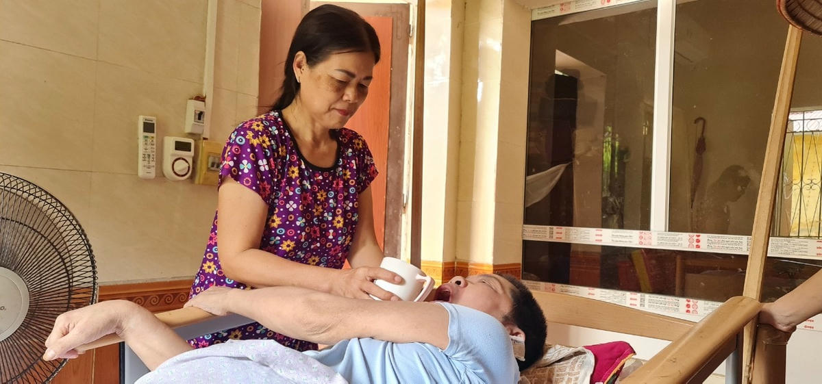 Ngoài những nhân viên Y tế của Trung tâm, đến đây, chúng tôi còn được gặp những người phụ nữ khác cũng đang mang hết tình cảm, sự yêu thương để chăm sóc cho các thương binh. Thương binh nặng Triệu Ngọc Thanh 63 tuổi nhưng đã điều dưỡng ở Trung tâm hơn 40 năm. Mấy năm qua sức khỏe yếu đi nhiều, ông không thể ngồi xe lăn, phải nằm trên giường, nói năng cũng khó khăn. Nhưng bên ông lúc nào cũng có người vợ là bà Nguyễn Thị Hồng cận kề chăm sóc.
