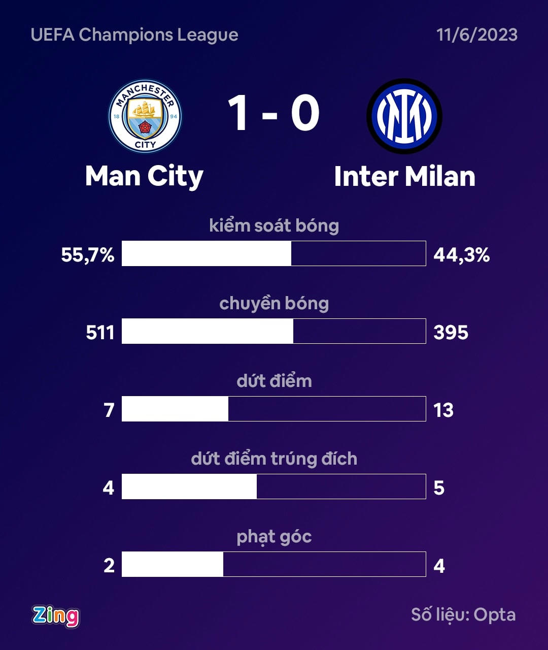 Trận chung kết khép lại với chiến thắng dành cho Man City. Inter đã bỏ lỡ nhiều cơ hội. Serie A có cú "hat-trick về nhì" ở cúp châu Âu mùa này, khi cả ba đại diện Italy (Inter, Roma, Fiorentina) đều gục ngã. Trong khi đó, Man City làm nên lịch sử với chức vô địch Champions League đầu tiên trong sự nghiệp, đồng thời trở thành đội bóng Anh thứ 2, sau Man United tạo cú ăn ba trong một mùa giải.