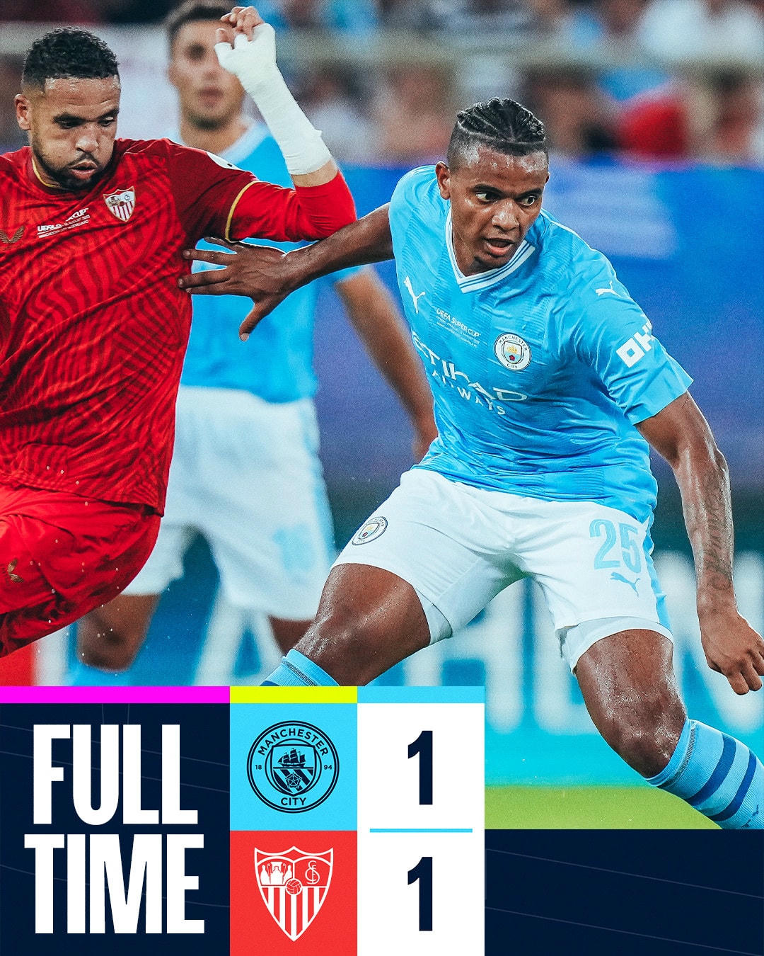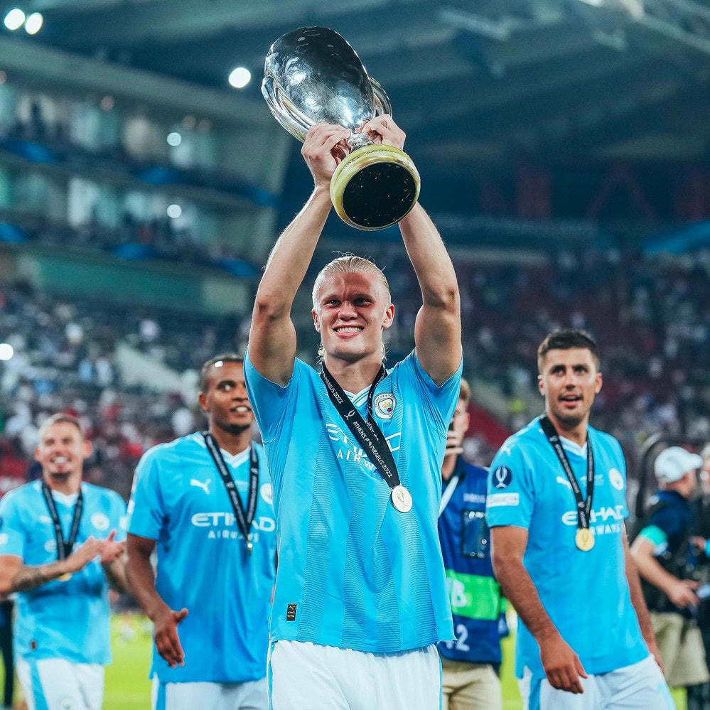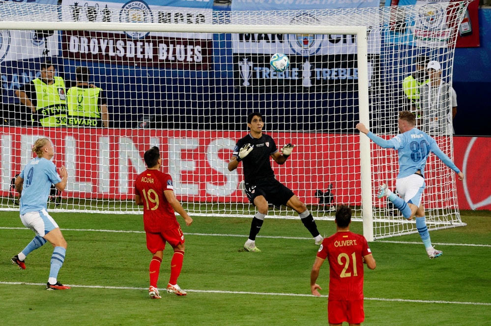Đội hình ra sân Man City.Đội hình ra sân Sevilla.Hai đội nhập cuộc khá sôi nổi.Phút 25, En-Nesyri bật cao đánh đầu tung lưới Man City.Niềm vui của tiền đạo người Maroc.Man City sau đó tạo ra nhiều cơ hội nhưng thủ thành Bono chơi xuất sắc.Đến phút 63, Cole Palmer lẻn xuống đánh đầu tung lưới Sevilla.Bàn gỡ hòa quý giá của tài năng trẻ người Anh.Rodri chính là người kiến tạo để Palmer lập công.90 phút chính thức khép lại với tỷ số hòa 1-1. Hai đội buộc phải phân định thắng thua trên chấm penalty.Haaland cùng các cầu thủ Man City đều sút 11m thành công.Duy nhất Gudelj bên phía Sevilla đá hỏng, dâng siêu cúp châu Âu cho đối thủ.Niềm vui vô bờ bến của dàn sao Man "xanh".Các cầu thủ Man City nhận Siêu cúp châu Âu.Đội trưởng Kyle Walker giương cao Super Cup 2023.Cole Palmer là người hùng của Man City.Haaland tiếp tục làm dày thêm bộ sưu tập danh hiệu.Haaland chụp lưu niệm cùng HLV Pep Guardiola.Chiến thắng nhọc nhằn nhưng xứng đáng của Man "xanh".