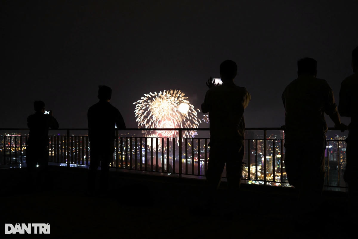 Trong ảnh, một nhóm công nhân tranh thủ ghi lại khoảnh khắc pháo hoa rực rỡ đón chào năm mới (Ảnh: Trần Đạt).