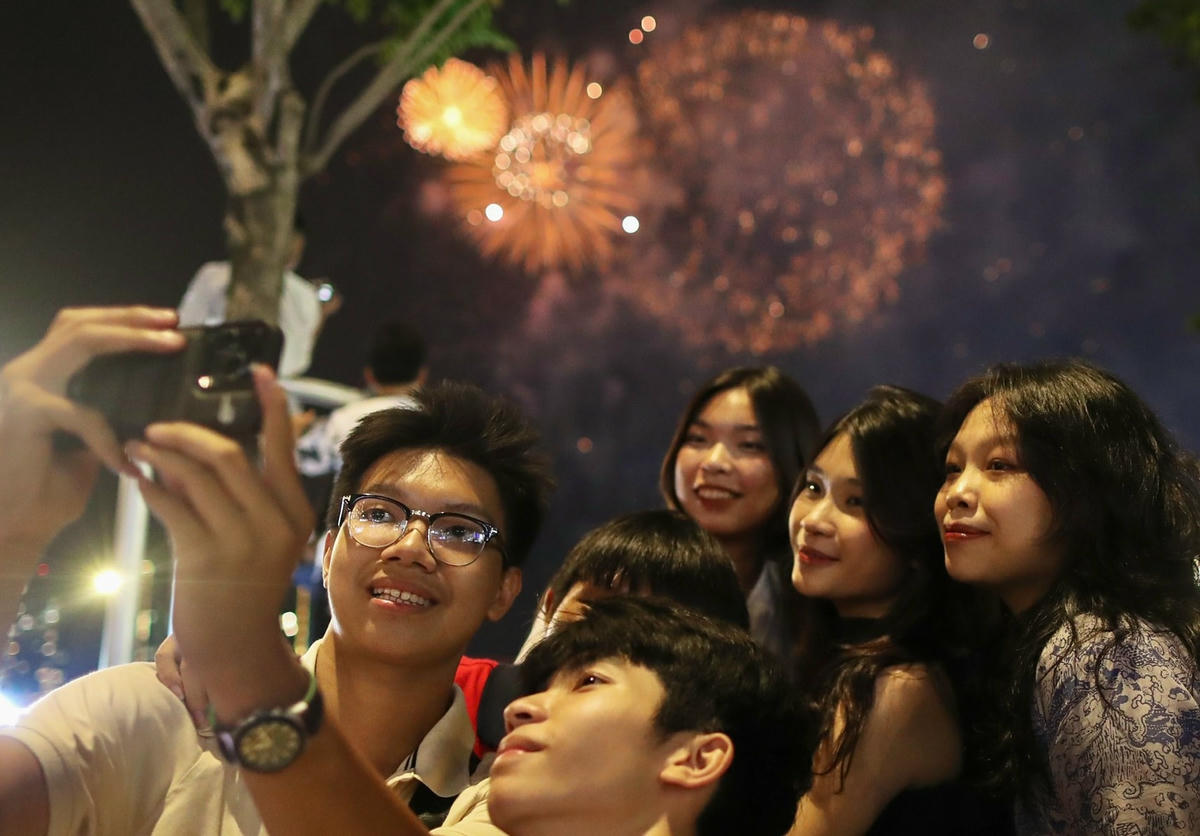 Nhóm bạn trẻ cùng nhau check-in, lưu lại khoảnh khắc đáng nhớ khi bước qua năm mới 2023 (Ảnh: Hải Long).