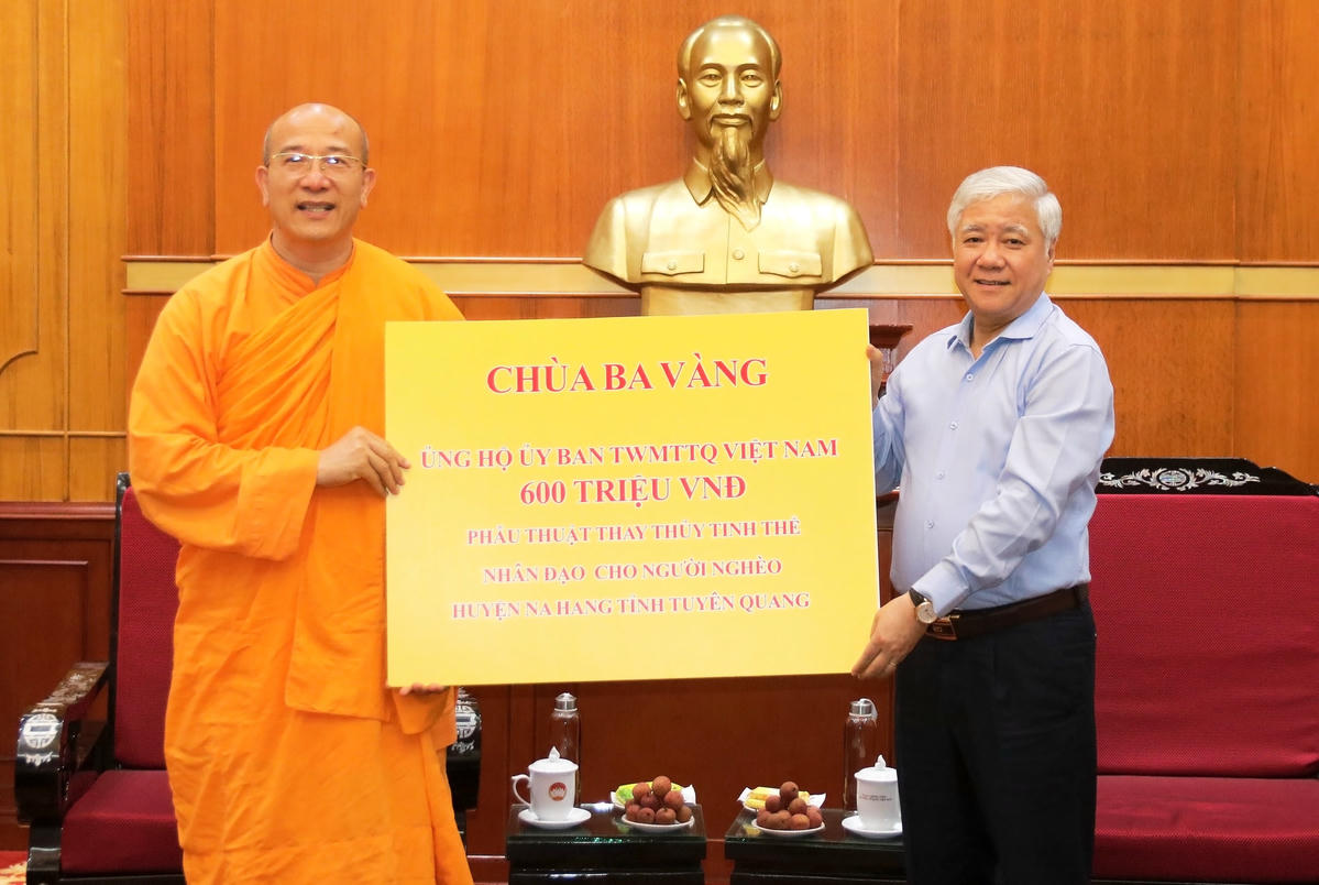 Chiều 7/7, tại Hà Nội, Bí thư Trung ương Đảng, Chủ tịch UBTƯ MTTQ Việt Nam Đỗ Văn Chiến đã tiếp nhận số tiền 600 triệu đồng từ Chùa Ba Vàng để góp thêm nguồn lực hỗ trợ phẫu thuật thay thủy tinh thể nhân đạo cho người nghèo trên địa bàn huyện Na Hang, tỉnh Tuyên Quang.