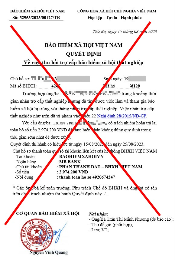 Tạo một tài khoản ngân hàng có đuôi là bảo hiểm xã hội (BHXH) Việt Nam, các đối tượng lừa đảo gửi một văn bản giả đến người lao động yêu cầu hoàn trả tiền trợ cấp thất nghiệp. Đây là chiêu lừa đảo mới mà người dân cần cảnh giác.