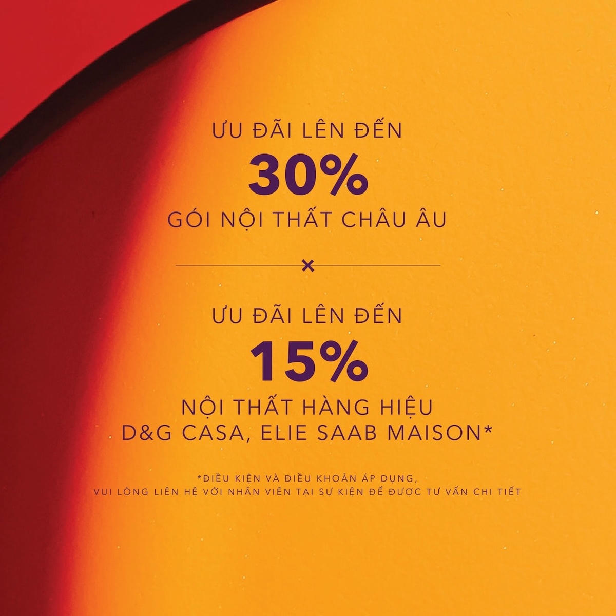 Những khách hàng tham gia triển lãm còn nhận được những ưu đãi độc quyền chưa từng có như: Tư vấn nội thất miễn phí bởi các chuyên gia châu Âu, cơ hội sở hữu các sản phẩm nội thất cao cấp 100% châu Âu với ưu đãi lên đến 30%, riêng nội thất hàng hiệu D&G Casa và Elie Saab Maison lần đầu tiên được phân phối tại Việt Nam với ưu đãi đến 15%. Khách hàng nhận nhà có thể yên tâm tận hưởng không gian sống tiện nghi chuẩn quốc tế từ kết cấu và tiện ích bên ngoài, cho đến chất lượng nội thất bên trong.
