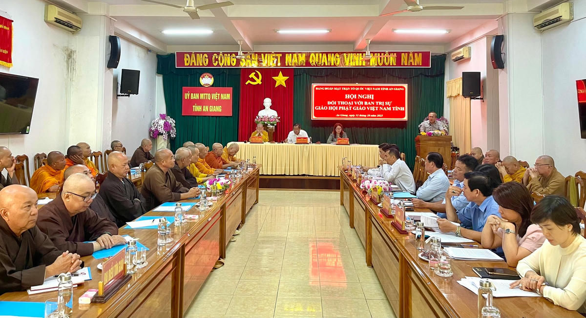 Tại buổi đối thoại, đại diện Ban Thường trực Ủy ban MTTQ Việt Nam tỉnh An Giang đã thông tin đến Ban Trị sự Giáo hội Phật giáo Việt Nam tỉnh về tình hình phát triển kinh tế - xã hội năm 2023 và định hướng năm 2024. Đồng thời, đại diện lãnh đạo các sở, ngành của tỉnh đã trao đổi, giải đáp các vấn đề và đề xuất, kiến nghị liên quan đến hoạt động tín ngưỡng, tôn giáo của các vị trong Ban Trị sự Giáo hội Phật giáo Việt Nam tỉnh.