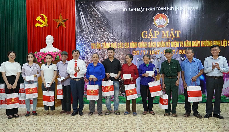 Tại buổi gặp mặt, Ủy ban MTTQ Việt Nam huyện Bố Trạch đã trao tặng 100 suất quà, trị giá mỗi suất 1,2 triệu đồng (gồm 1 triệu đồng tiền mặt và một phần quà trị giá 200 nghìn đồng) cho các thân nhân gia đình liệt sĩ, thương binh, bệnh binh, người có công với cách mạng có hoàn cảnh đặc biệt khó khăn.