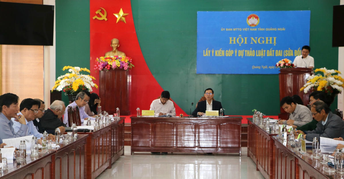 Ngày 23/2, Ủy ban MTTQ Việt Nam tỉnh Quảng Ngãi tổ chức Hội nghị lấy ý kiến đối với Dự thảo Luật đất đai (LĐĐ) sửa đổi. Ông Võ Thanh An, Trưởng ban Dân vận Tỉnh ủy, Chủ tịch Ủy ban MTTQ Việt Nam tỉnh Quảng Ngãi và ông Nguyễn Bá Minh, Phó Chủ tịch Ủy ban MTTQ Việt Nam tỉnh Quảng Ngãi đồng chủ trì Hội nghị.