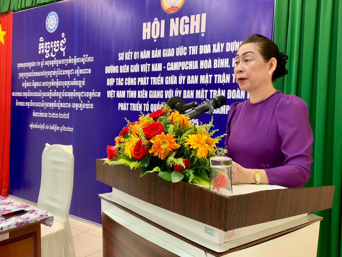 “Để tiếp tục triển khai thực hiện tốt các nội dung trong kế hoạch thi đua xây dựng đường biên giới giai đoạn 2023-2025 đạt hiệu quả thiết thực trong những năm tiếp theo, tôi mong lãnh đạo Mặt trận 2 tỉnh giáp biên tập trung lãnh đạo triển khai, tuyên truyền đến nhân dân thực hiện nghiêm các quy định đường biên giới, giữ gìn cột mốc, giữ vững an ninh trật tự, chấp hành nghiêm quy chế qua lại biên giới, thắt chặt tình đoàn kết.; Tiếp tục tăng cường công tác an sinh xã hội, tổ chức thường xuyên thăm hỏi, giao lưu văn hóa, văn nghệ, thể dục thể thao,…” - Chủ tịch Ủy ban MTTQ Việt Nam tỉnh Kiên Giang Lê Thị Vệ phát biểu tại hội nghị.
