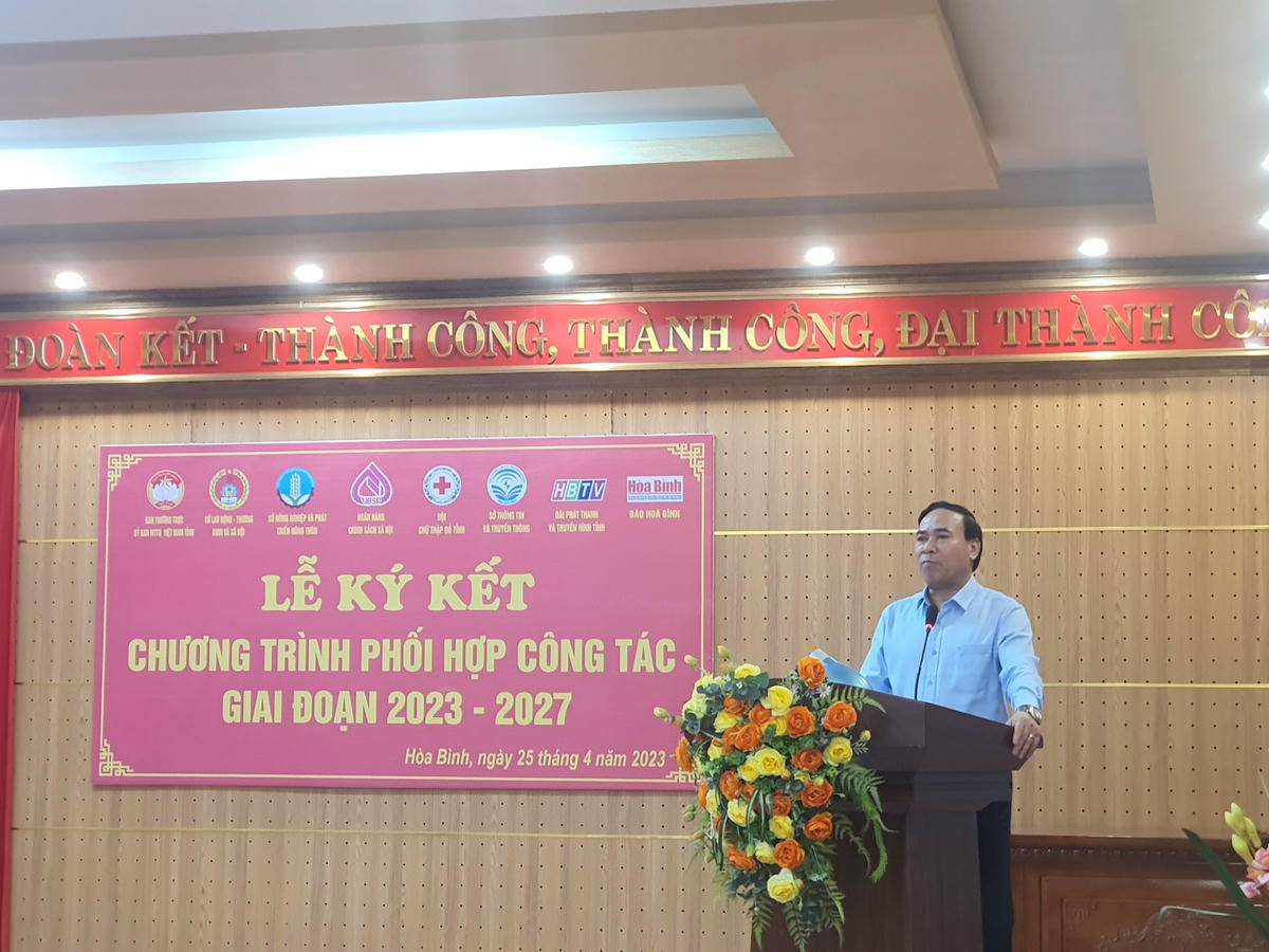 Phát biểu tại buổi lễ, ông Trần Đức Trường - Phó Chủ tịch Ủy ban MTTQ Việt Nam tỉnh Hòa Bình thông tin về công tác phối hợp với Ngân hàng chính sách xã hội tỉnh Hòa Bình, từ năm 2018 - 2022, Uỷ ban MTTQ Việt Nam tỉnh luôn gắn việc thực hiện công tác an sinh xã hội, xóa đói, giảm nghèo với nhiệm vụ chuyên môn của đơn vị cụ thể: Quỹ “Vì người nghèo” cấp tỉnh vận động được trên 53 tỷ đồng, xây dựng, sửa chữa được trên 1 nghìn căn nhà trị giá trên 35 tỷ; hỗ trợ trên 15 nghìn suất quà trị giá trên 9,3 tỷ đồng cho hộ nghèo ăn Tết.