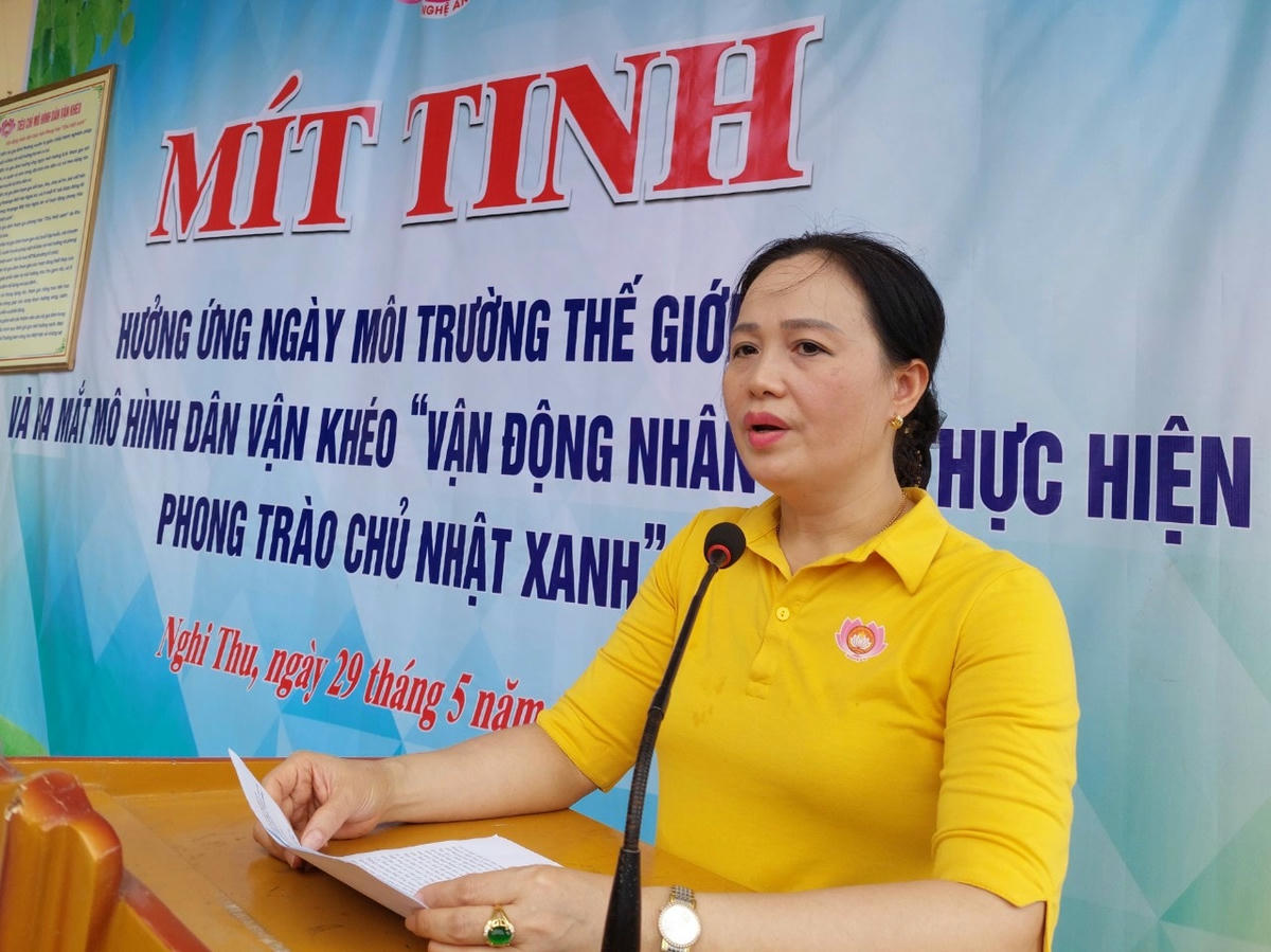 Phát biểu tại lễ mít tinh, bà Nguyễn Thị Thu Hương, Phó Chủ tịch Ủy ban MTTQ tỉnh Nghệ An cho biết, đây là hoạt động trên cơ sở thực hiện Chương trình phối hợp số 05, ngày 12/01/2021 giữa Ban Thường trực UBTƯ MTTQ Việt Nam với Bộ TNMT về thực hiện nhiệm vụ trong lĩnh vực TNMT giai đoạn 2021-2025 và Chương trình phối hợp giữa 2 đơn vị của tỉnh Nghệ An (Mặt trận và TNMT).