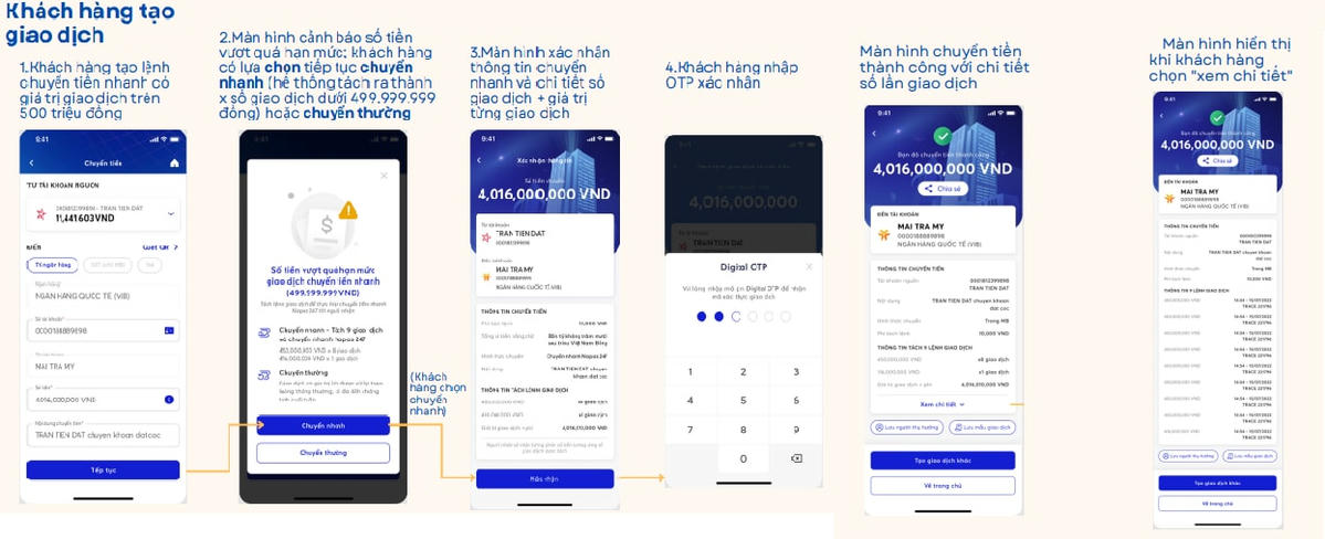 Với "Tách lệnh tự động", khi khách hàng chuyển tiền tỷ sẽ được chia nhỏ thành nhiều món với giá trị 450 triệu và phần dư, nhằm đảm bảo món tiền đó sẽ được chuyển nhanh 24/7 tới tay người nhận ngay tức thời. Đồng thời, mức chuyển khoản lên tới 5 tỷ đồng/ lần, giúp khách hàng tiết kiệm thời gian khi chuyển khoản liên ngân hàng.
