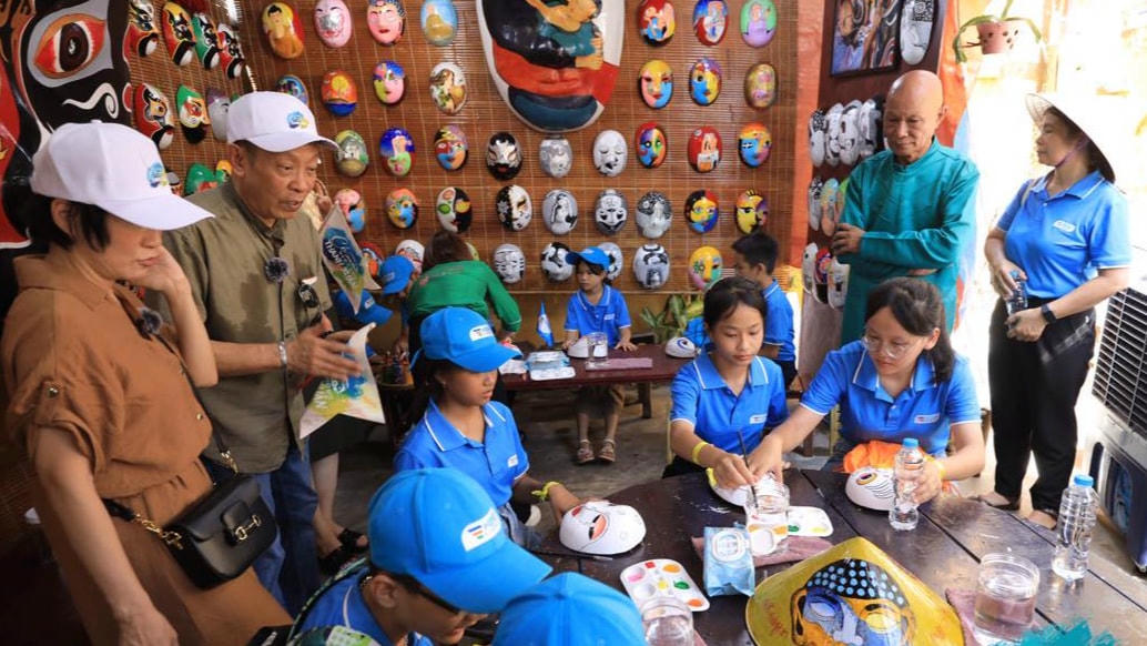 Tại điểm trải nghiệm làm mặt nạ tuồng, các em nhỏ được nghe nghệ nhân Bùi Quý Phong chia sẻ: “Mỗi chiếc mặt nạ tinh tế, ti mỉ trong từng chi tiết mang tính cách, tâm hồn của nhân vật. Đây là chiếc mặt nạ của người Việt Nam, vẽ để gửi thông điệp về thiện lành, về tình yêu thương, bác ái”... Lần đầu tiên, các em nhỏ trường Hope được tự tay chọn màu sắc trang trí cho chiếc mặt nạ của mình.