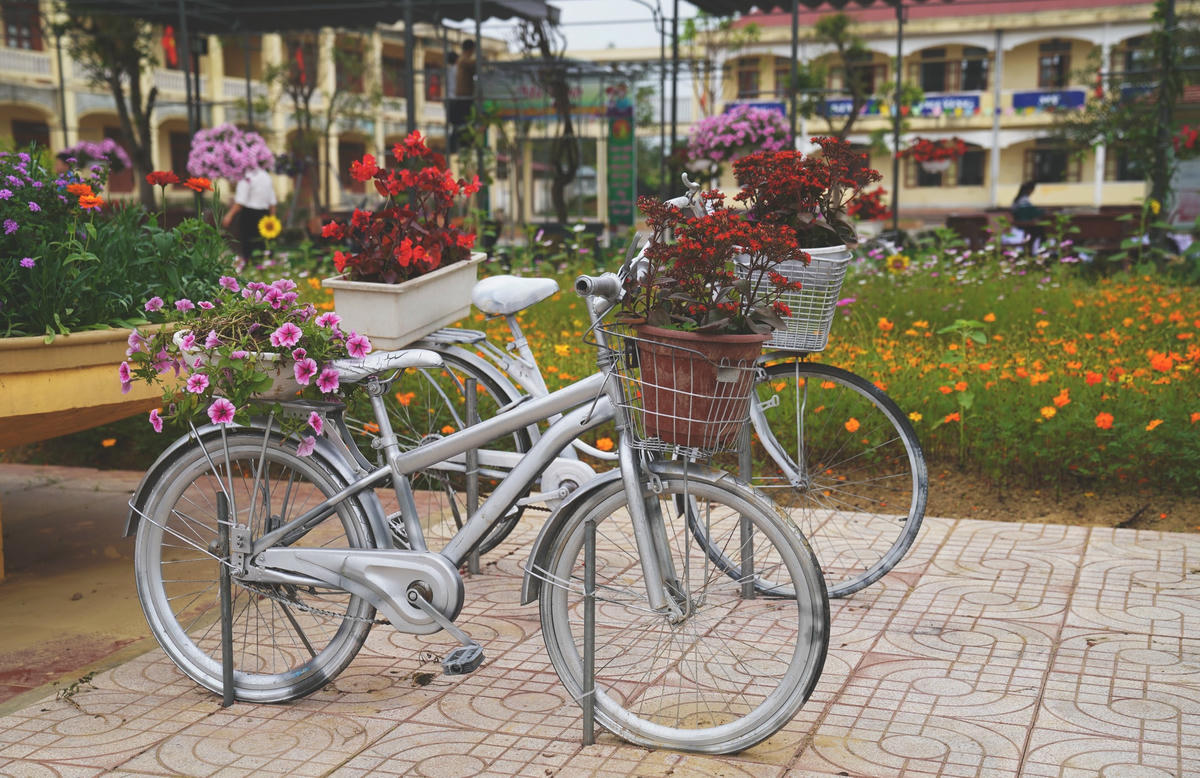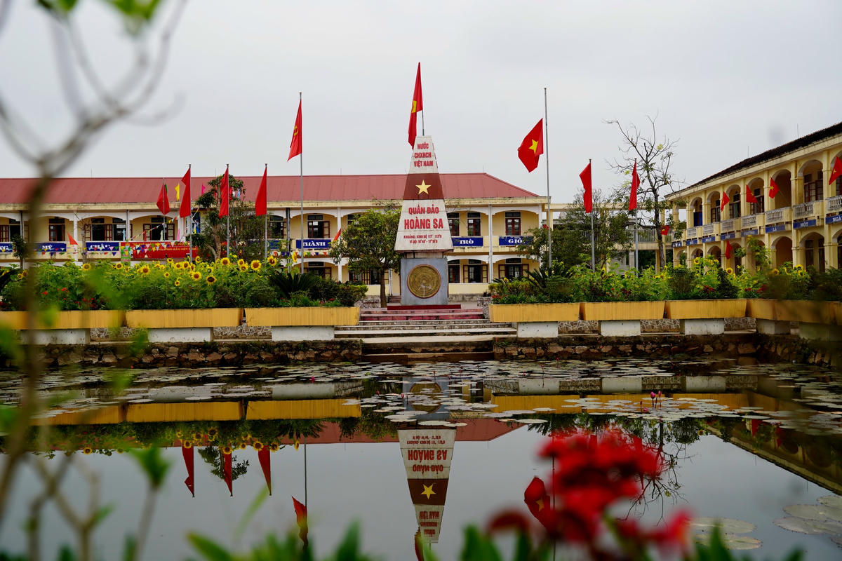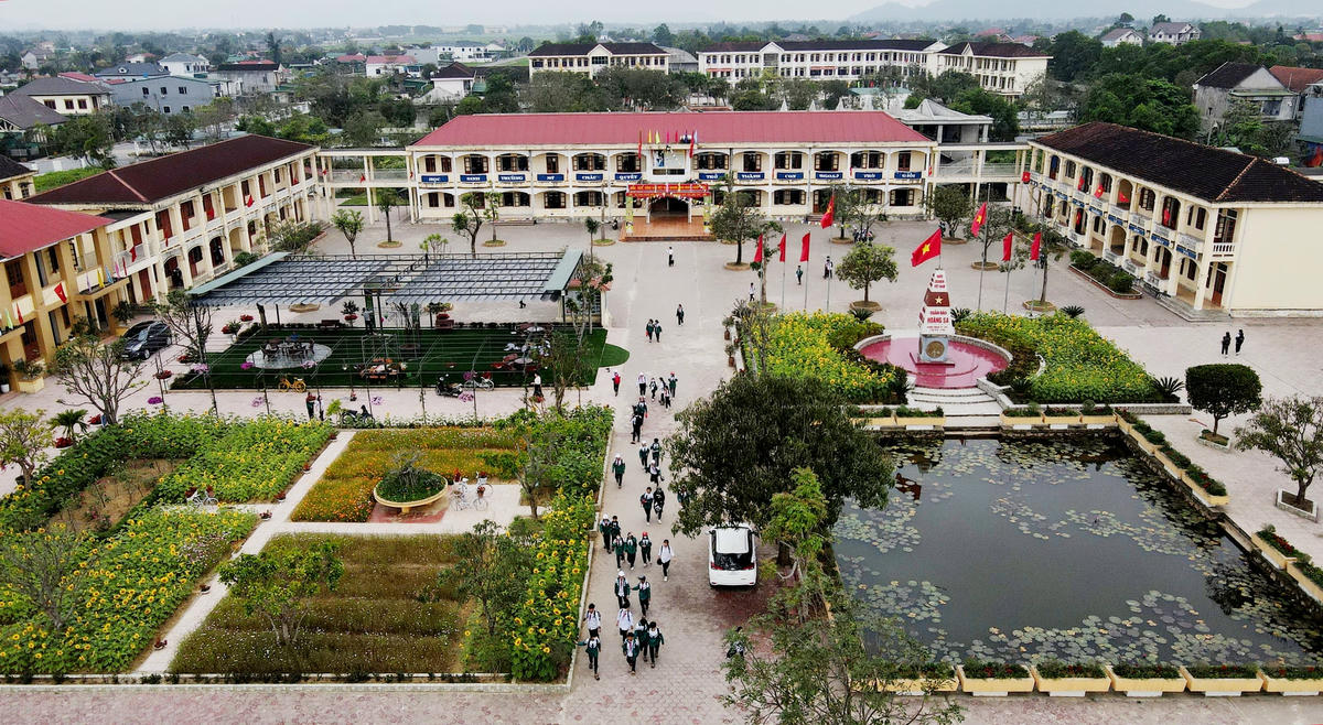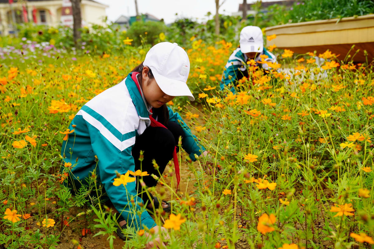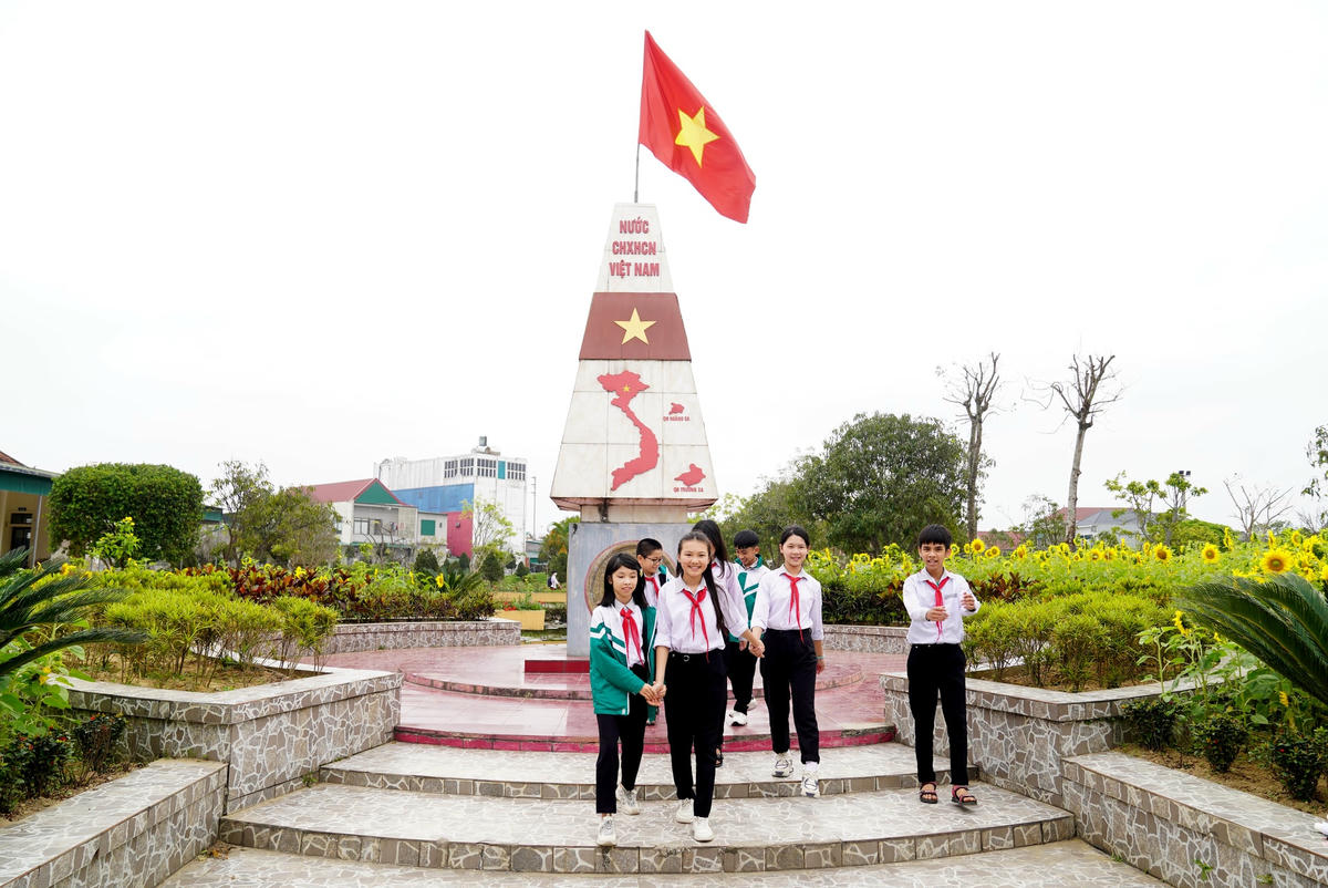 Trường THCS Mỹ Châu (xã Thạch Châu, huyện Lộc Hà, tỉnh Hà Tĩnh) như một công viên thu nhỏ, giáo viên và học sinh nơi đây tỏ ra thích thú trước khung cảnh vườn trường tràn đầy màu xanh và sắc hoa.