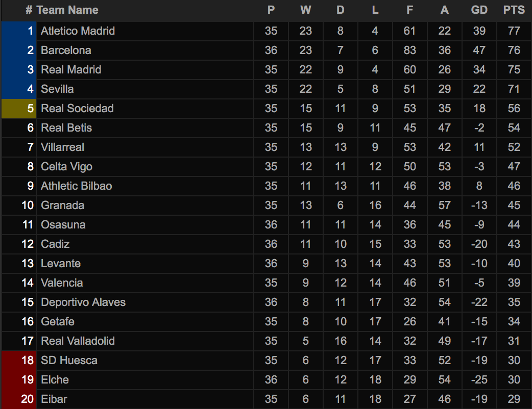 Barcelona đứng thứ hai La Liga với 76 điểm/36 trận. Atletico tiếp tục dẫn đầu với 77 điểm/35 trận, còn Real Madrid xếp thứ ba với 75 điểm/35 trận. Nếu cả hai CLB thành Madrid đều thắng ở vòng 36 này, Barcelona gần như tan mộng vô địch.