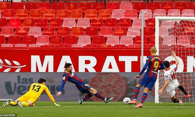 Hai phút sau, Messi thực hiện cú đá phạt hướng thẳng vào khung thành Sevilla từ khoảng cách hơn 30m chếch bên cánh trái khiến thủ môn đội chủ nhà đã xuất sắc cứu thua. Trong thế trận chặt chẽ, khoảnh khắc ngôi sao của các cầu thủ Barca đã được phát huy.