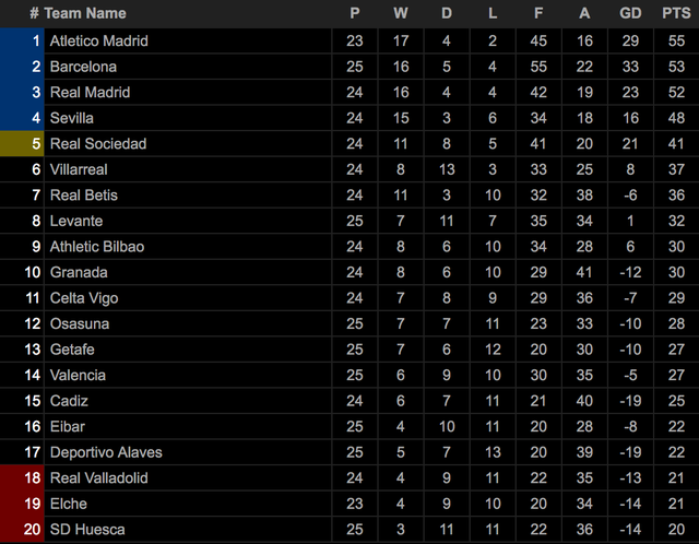 3 điểm giành được tại Sanchez Pizjuan giúp Barcelona vươn lên thứ hai tại La Liga 53 điểm/25 trận, vượt lên trên Real Madrid (52 điểm/24 trận). Đội bóng đang dẫn đầu La Liga vẫn đang là Atletico với 55 điểm/23 trận.