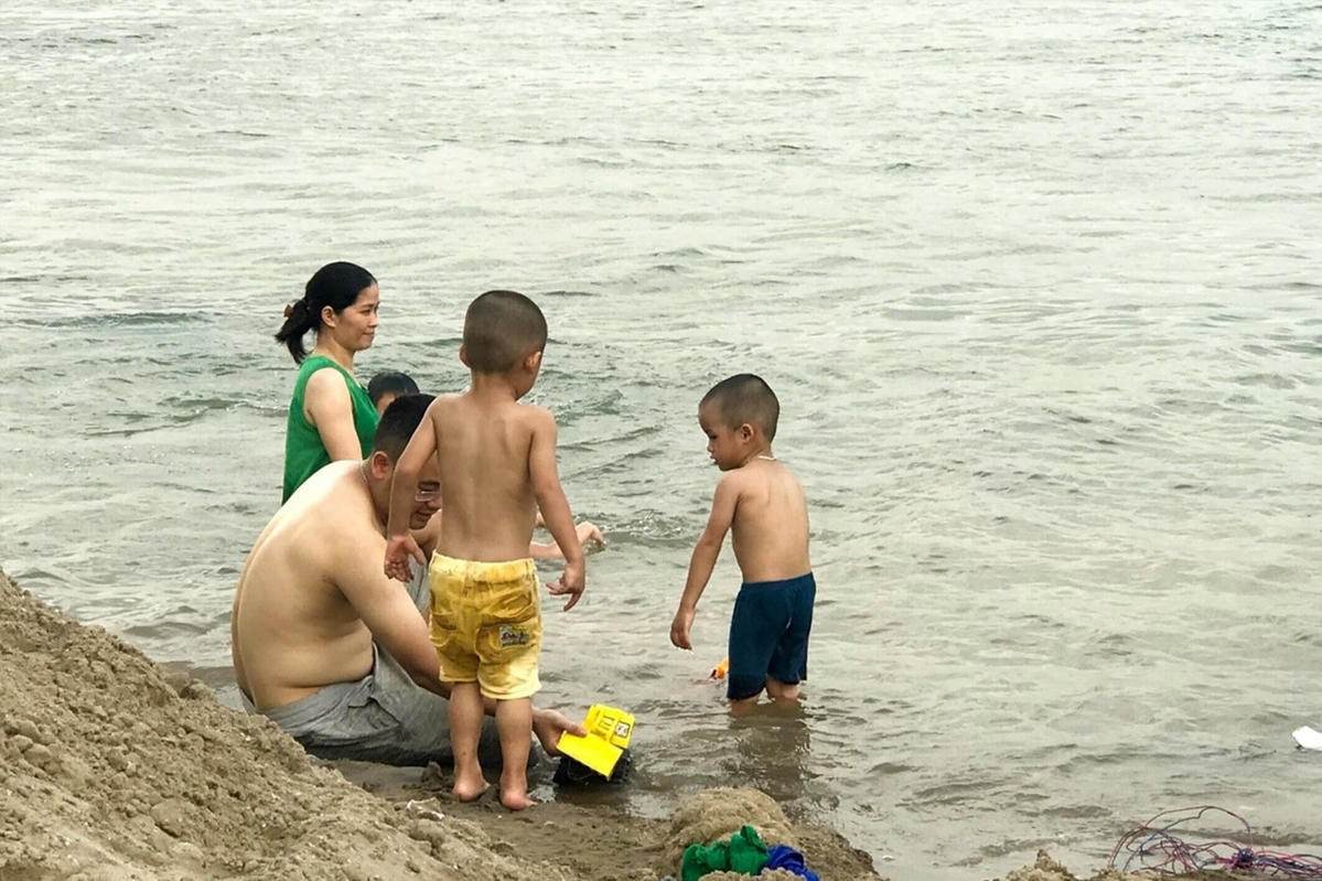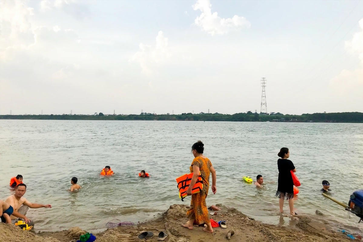 Mòn mỏi đợi mưa, người dân Hà Nội ‘giải nhiệt’ với ‘bể bơi’ sông Hồng