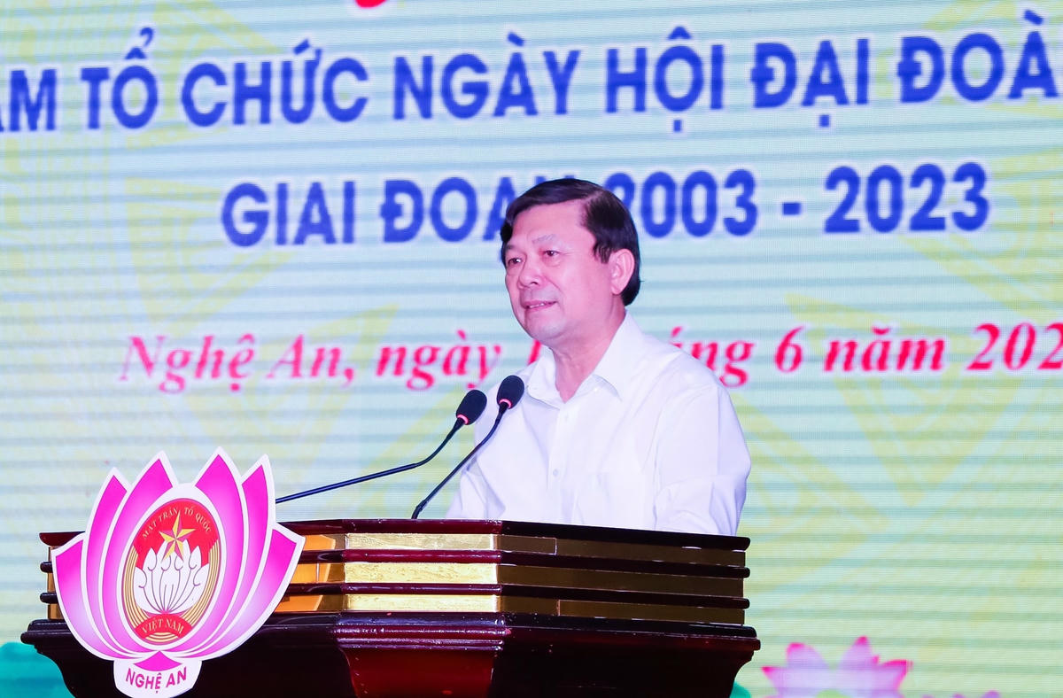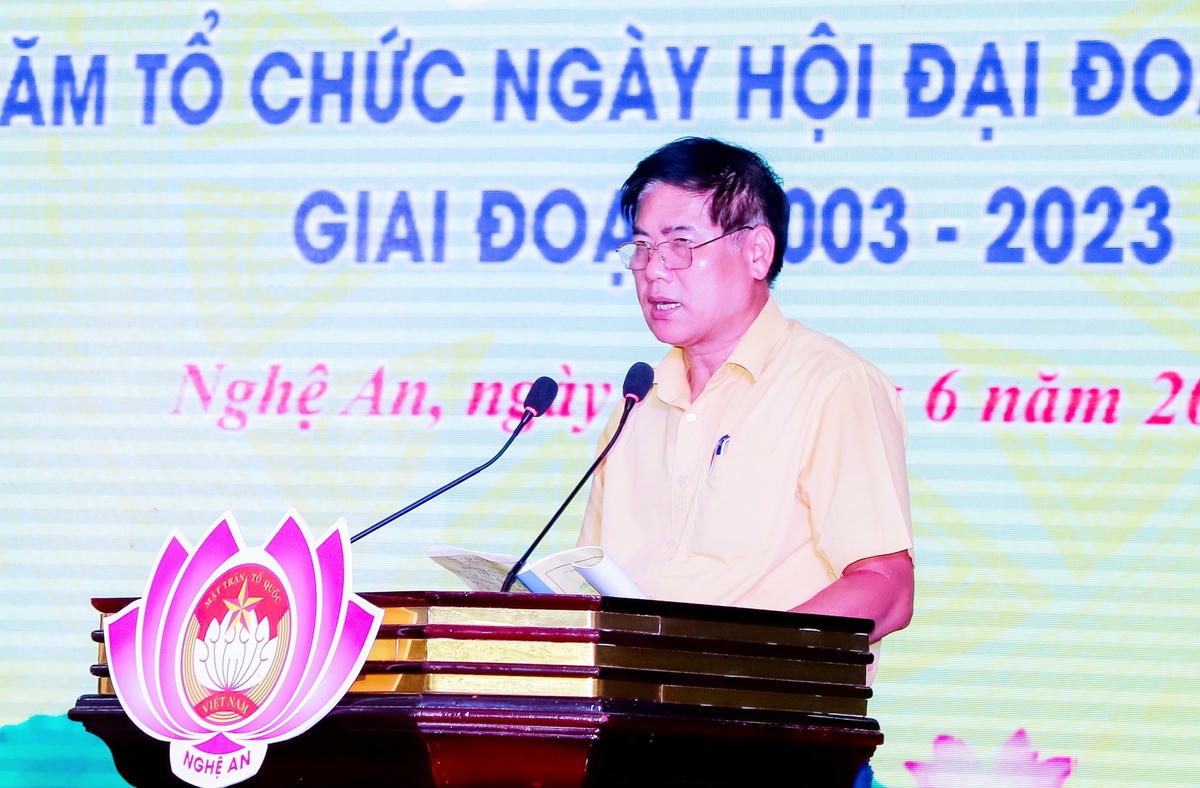 Sáng ngày 16/6, Uỷ ban MTTQ tỉnh Nghệ An đã tổ chức Hội nghị tổng kết 20 năm Ngày hội Đại đoàn kết toàn dân tộc giai đoạn 2003-2023. Tham dự chương trình có ông Nguyễn Hữu Dũng, Phó Chủ tịch UBTƯ MTTQ Việt Nam; ông Nguyễn Đức Trung, Chủ tịch UBND tỉnh Nghệ An, các cán bộ Mặt trận tiêu biểu trong toàn tỉnh.
