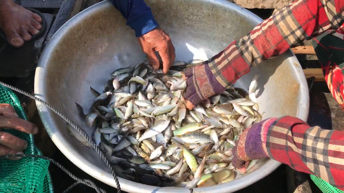 Đưa bàn tay thoăn thoắt kéo dớn, đoạn lưới cuối cùng vừa nhô lên khỏi mặt nước, anh Hồng nở nụ cười nhẹ nhõm khi thấy đàn cá nặng tay quẫy đạp. “Tay này được không dưới 1 ký đâu. Đoạn này gần kênh, nước từ đồng chảy qua lại nên cá đi rất nhiều”, vừa nói, anh Hồng vừa dốc túi lưới đổ cá vào chiếc thau bằng nhôm đặt giữa ghe. Lúc này tới công việc của chị Bé Ba, vợ anh Hồng. Chị Ba dùng một chiếc kẹp nhỏ gắp những con cá heo bóng nhẫy chừng như ngón tay cái bỏ riêng. Mùa này, cá heo rất có giá, mỗi kg bán được 120 ngàn đồng.