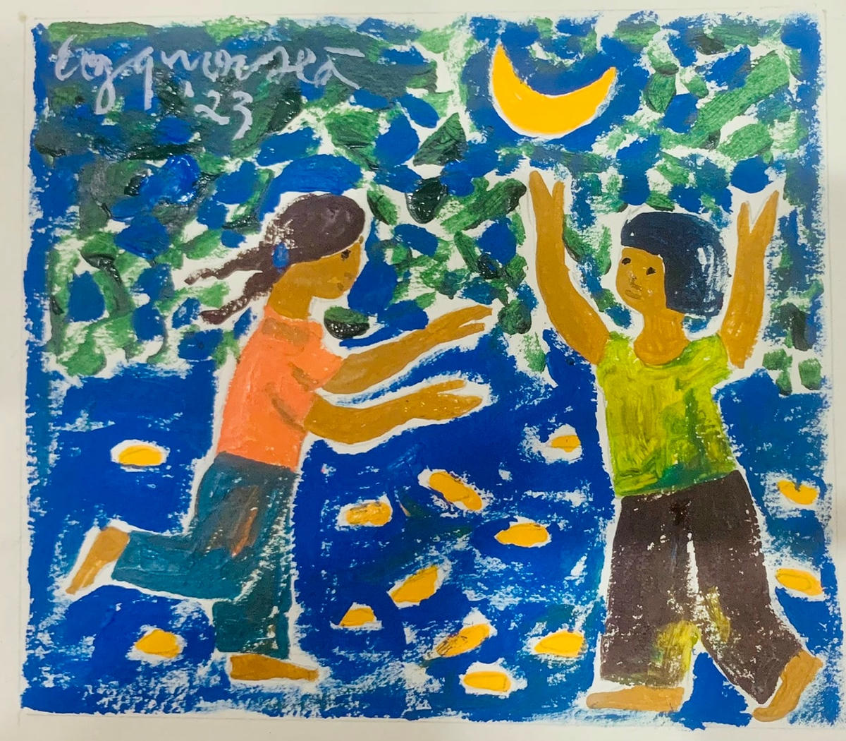 Vào rằm tháng Tám, mặt trăng sẽ to tròn và sáng nhất, lúc ấy chúng tôi cùng nhau mang trống ếch, đèn ông sao ra đi quanh làng và rước cỗ trông trăng. Tôi từng nghĩ ánh trăng đổ xuống là để dát vàng dát bạc lên cảnh vật trần gian. Những mặt ao lóng lánh, những bóng cây huyền ảo và những mặt sân, góc vườn, con đường… đều đẹp lung linh. Trên chiếc sân gạch nhà tôi, qua tán lá, ánh trăng rắc lên những bông hoa tròn biết nhảy múa, sống động như một cuốn phim hoạt hình đang trình chiếu. Chúng tôi vui đùa dưới trăng với những trò chơi bất tận.
