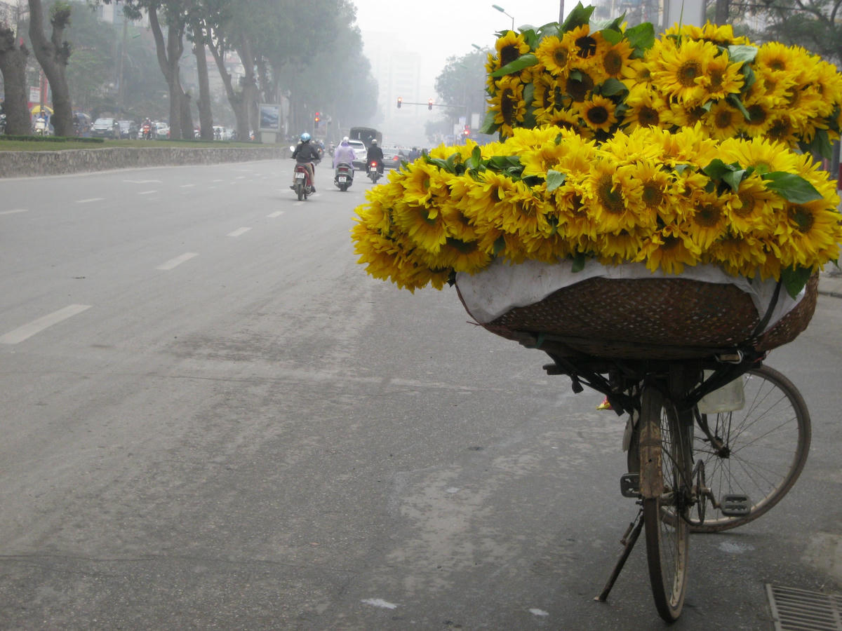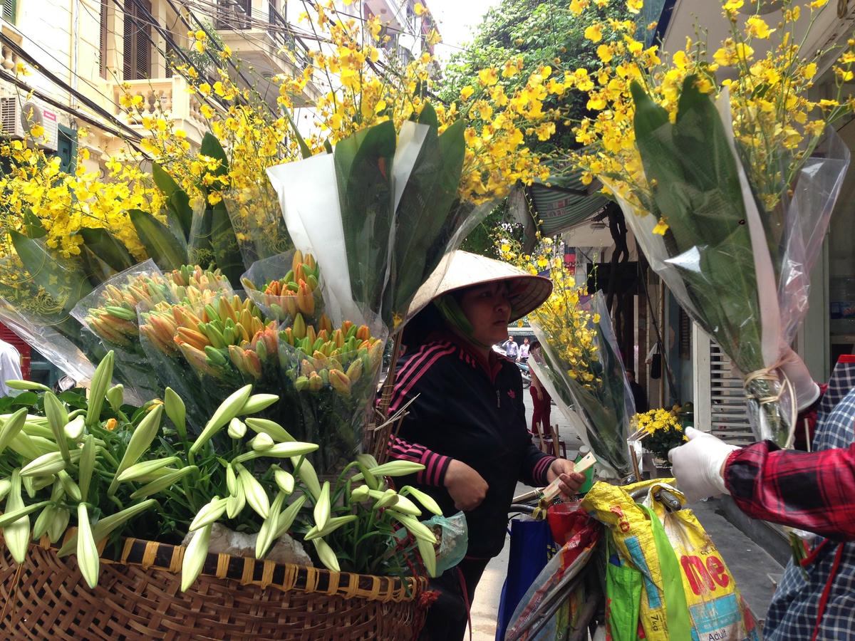 Rất nhiều du khách nước ngoài khi đến với Hà Nội thích thú với hình ảnh những người phụ nữ đội nón lá đạp xe chở hoa tươi rong ruổi trên đường phố.