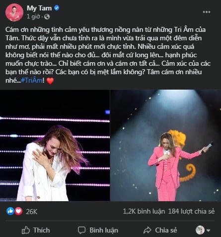 Mỹ Tâm cảm động viết: “Cám ơn những tình cảm yêu thương nồng nàn từ những Tri Âm của Tâm. Thức dậy vẫn chưa tỉnh ra là mình vừa trải qua một đêm diễn như mơ, phải mất nhiều phút mới chực tỉnh”.