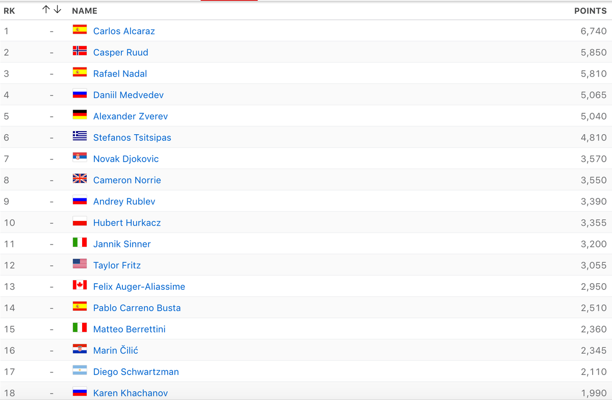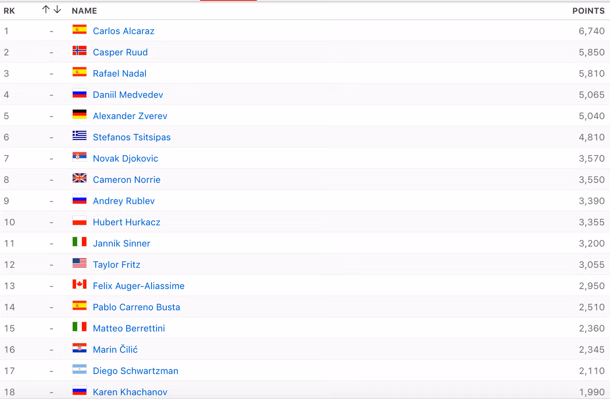 Trong 3 tháng cuối năm, 10 giải ATP 250, 4 giải ATP 500, một giải ATP Masters 1000 và ATP Finals sẽ diễn ra. Nadal đang kém Alcaraz 930 điểm nhưng nếu thi đấu không tốt, Alcaraz có nguy cơ bị trừ điểm và mất ngôi số một ATP vào tay Nadal.