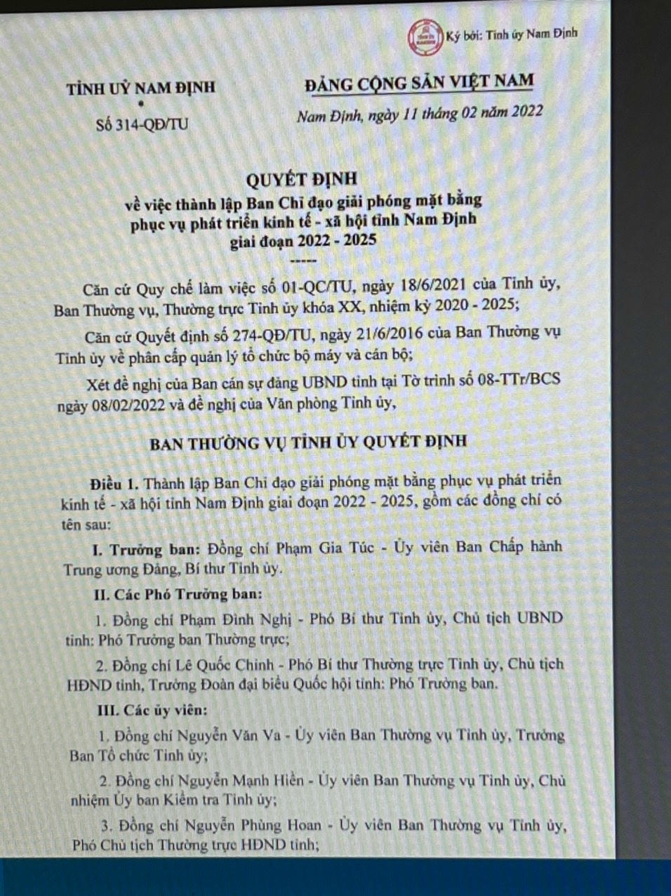 Ngày 15/2, thông tin với Đại Đoàn Kết Online, ông Trần Anh Dũng, Thường vụ Tỉnh ủy, Phó Chủ tịch thường trực UBND tỉnh Nam Định cho biết, Ban Thường vụ Tỉnh ủy vừa ban hành quyết định thành lập Ban chỉ đạo giải phóng mặt bằng phục vụ phát triển kinh tế - xã hội tỉnh Nam Định giai đoạn 2022-2025, trên cơ sở đề nghị của Ban cán sự đảng UBND tỉnh.