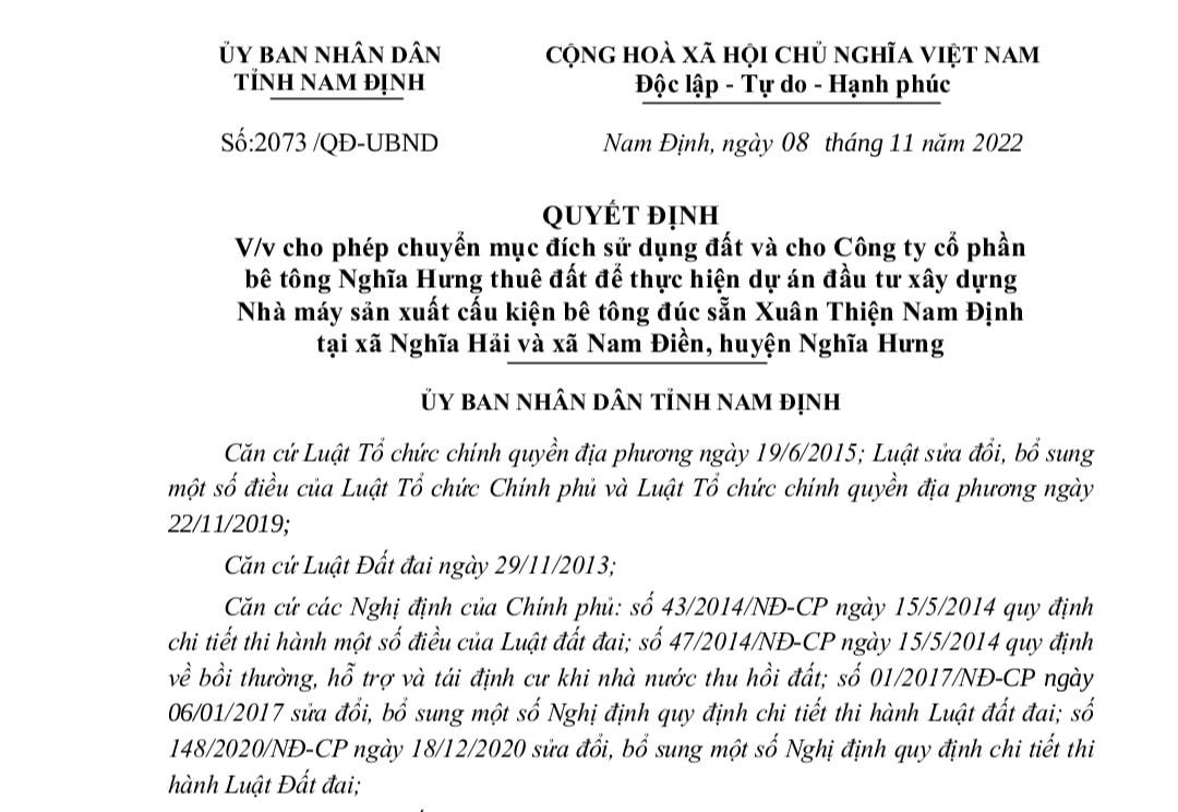 Trước đó, ngày 8/11, Phó Chủ tịch Thường trực UBND tỉnh Nam Định Trần Anh Dũng đã ký quyết định cho phép chuyển mục đích sử dụng đất và cho Công ty CP bê tông Nghĩa Hưng thuê hơn 568.000 m2 đất (đã được UBND tỉnh ra quyết định thu hồi) tại xã Nghĩa Hải và xã Nam Điền, huyện Nghĩa Hưng để thực hiện dự án đầu tư xây dựng Nhà máy sản xuất cấu kiện bê tông đúc sẵn Xuân Thiện Nam Định.