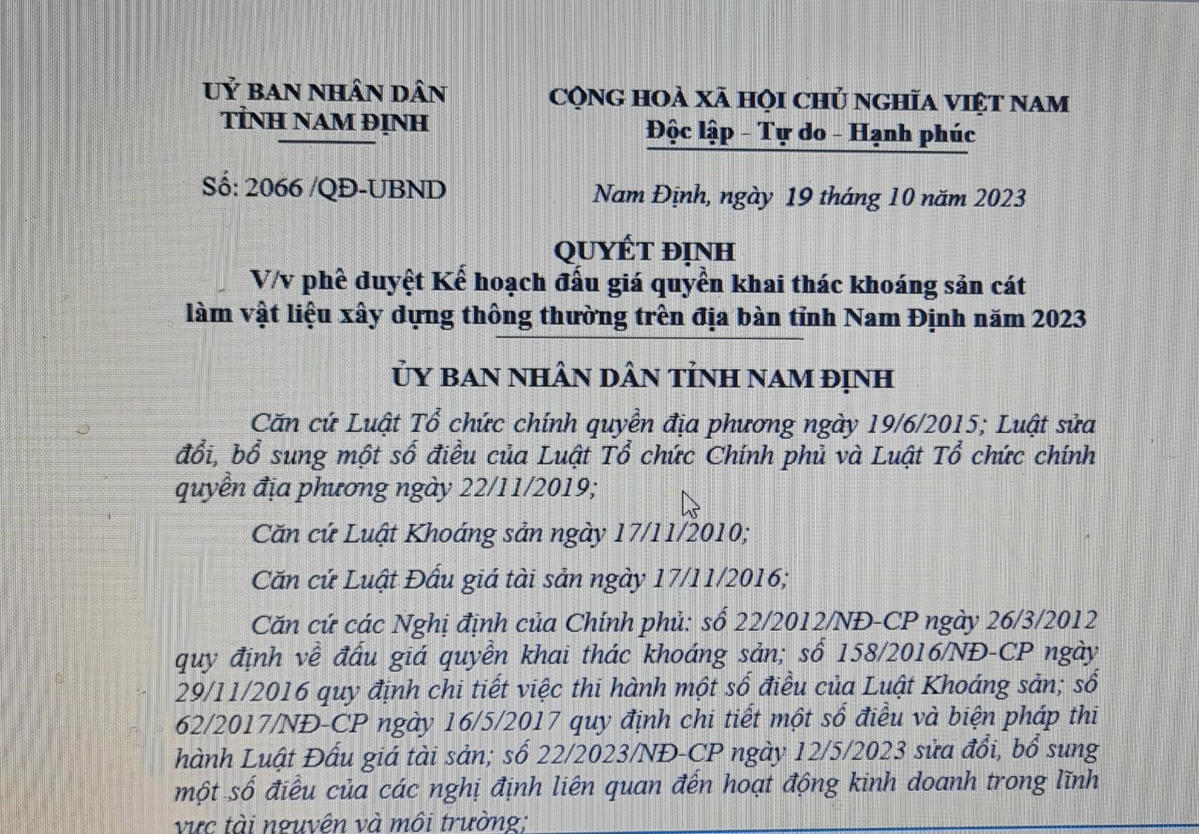 Kế hoạch đấu giá quyền khai thác khoáng sản cát của chính quyền tỉnh Nam Định ban hành trong bối cảnh nhiều công trình, dự án ở tỉnh và ở nhiều tỉnh, thành khác gặp khó khăn về nguồn vật liệu san lấp mặt bằng; hoạt động khai thác cát lậu diễn biến phức tạp.