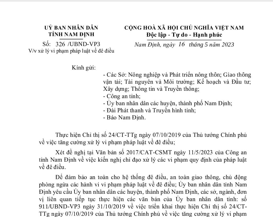 Ngày 16/5, UBND tỉnh Nam Định ban hành văn bản hối thúc các sở ngành liên quan cùng UBND 10 huyện, thành phố thực hiện các biện pháp “rắn” xử lý vi phạm đê điều, kéo dài danh sách các văn bản chỉ đạo có nội dung tương tự trong bối cảnh tình trạng vi phạm được ghi nhận vẫn tiếp tục gia tăng, diễn biến phức tạp trên địa bàn.