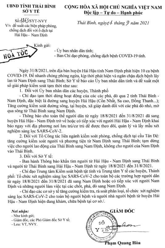 Sáng nay, 1/9, Giám đốc Sở Y tế Thái Bình Nguyễn Quang Hòa đã ký văn bản hỏa tốc gửi UBND tỉnh, Ban chỉ đạo phòng chống dịch Covid-19 tỉnh báo cáo, đề xuất một số giải pháp kiểm soát dịch tạm thời nhằm nhanh chóng phòng ngừa, kịp thời phát hiện, ngăn chặn dịch Covid-19 lây lan từ Nam Định sang Thái Bình.
